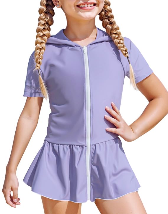 Girls Sun Protective Swim Cover Up Hooded with Full-Length Zipper Short Sleeve UPF 50+ Beach Dress Coverup 7