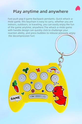• Play anytime and anywhere: Fast push pop it game Backpack pendants. Quick whack-a-mole game, this keychain is easy to carry, whether you are indoors, outdoors, or traveling, you can easily enjoy the fun of the game anytime, anywhere.The whack-a-mole game with handle design can quickly click to challenge your reaction ability, and press bubbles to release pressure, enjoy the decompression fun!