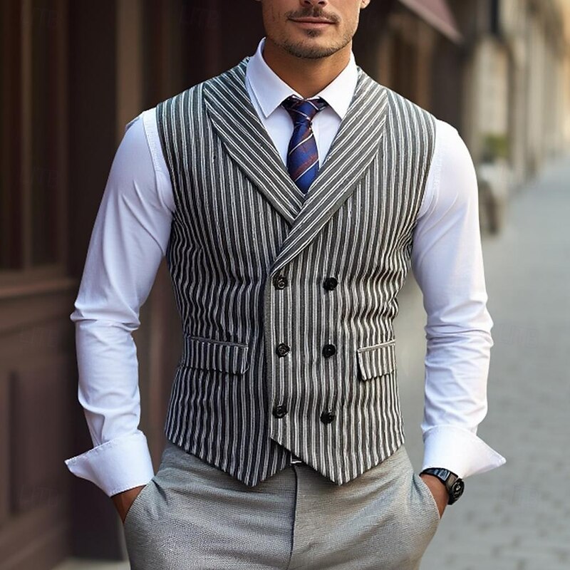 Men's Waistcoat Cocktail Attire Wedding Guest Casual Vintage Spring Fall Double Breasted Polyester Adjustable Striped Slim Fit Light Grey Dark Gray Vest 10