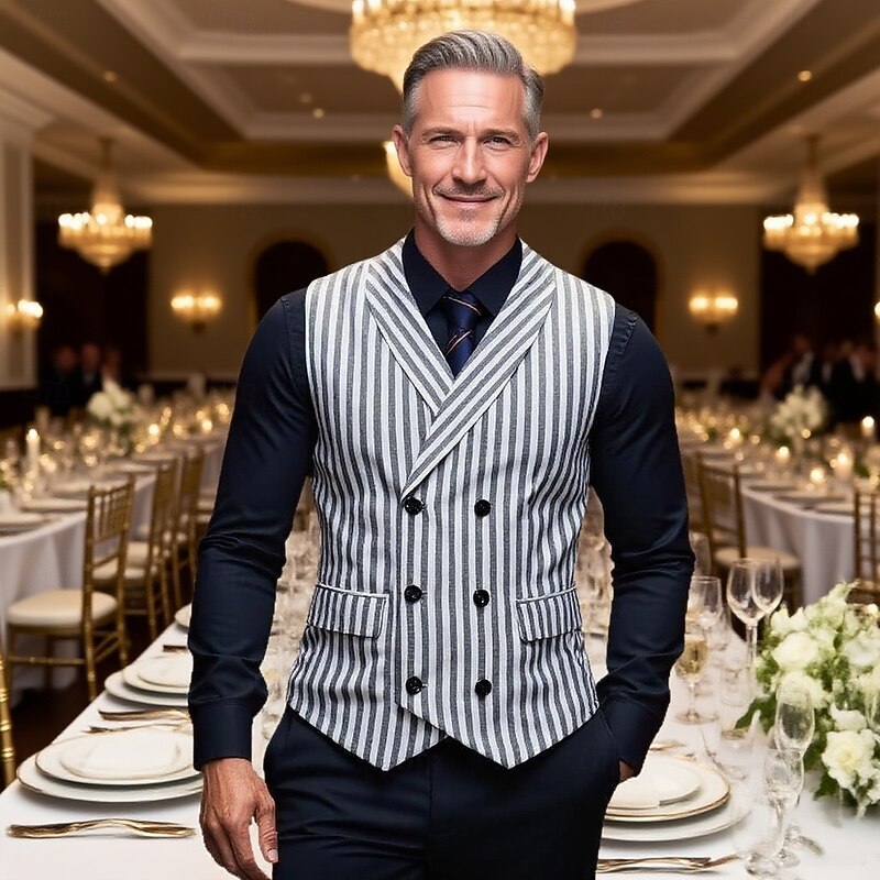 Men's Waistcoat Cocktail Attire Wedding Guest Casual Vintage Spring Fall Double Breasted Polyester Adjustable Striped Slim Fit Light Grey Dark Gray Vest 5