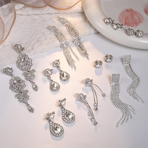 • Silver Clip-On Earrings: Shiny clip-on earrings for women, with nine different stunning designs for your choice, full of luxury; Including geometric rhinestone clip on earrings, teardrop clip earrings, chandelier wedding earrings, long tassle dangle earrings, classic hollow rhinestone earrings, etc; Such a wonderful clip on earrings that can create a romantic and elegant atmosphere and make you more attractive, definitely worth a try