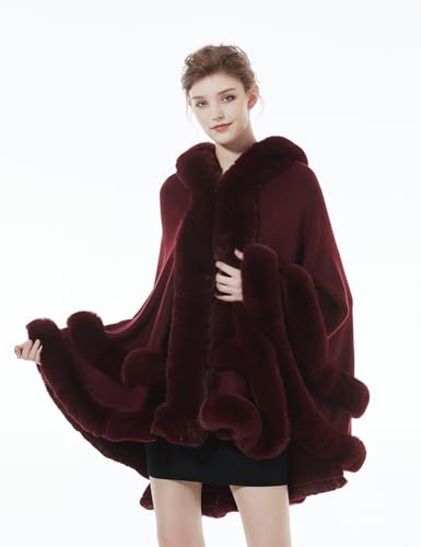BEAUTELICATE Women Knit Cape Coat Knitted Hooded Cloak Poncho with Fur Trims Faux Fur Shawl 1