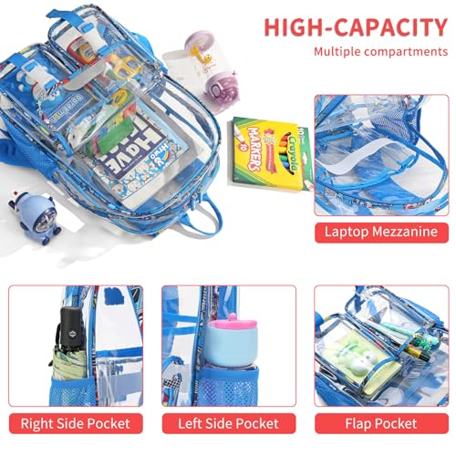 • Attractive and Functional Design: Clear stadium backpack features a vibrant sky-blue hue and playful car and robot graphics that your childrens will love, combined with a transparent design that speeds up security checks at school or during travel.