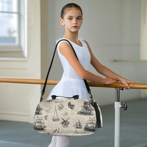 HOT ! Beige Pirate Sailing Ships Skull Flags CuwrYet Duffel Bag Sports Gym Bag Travel Overnight Bag With Shoe Compartment School Dance Tote Weekender Bag For Boys Girls Kids