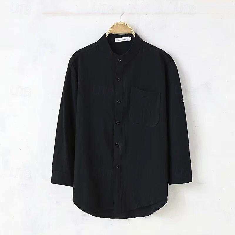 Highlights [Fabric] : Crafted from a breathable 50% flax blend, this men's shirt ensures comfort and style for the spring and fall seasons. The lightweight material offers a relaxed and comfortable fit, making it perfect for various occasions. [Style] : Featuring a sleek band collar and a versatile button-down front, this shirt presents a clean and minimalistic look. The 3/4 length sleeves add a touch of modernity while maintaining a classic silhouette. The hemline is slightly curved to enhance the relaxed fit and overall sophistication. [Design Highlights] : This shirt includes a practical single chest pocket, adding functionality without compromising style. The plain pattern enhances its timeless appeal, making it a staple piece in any wardrobe. [Occasions] : Ideal for vacations, holiday outings, casual daily wear, and streetwear, this shirt embodies a casual yet fashionable style. Whether you're attending a relaxed beach gathering or enjoying daily city life, this shirt adapts effortlessly to a variety of settings. [Size Range] : Available in a range of sizes from S to 2XL, ensuring a comfortable fit for various body types. This versatile piece can be easily styled for both casual and semi-formal events, offering both elegance and ease.