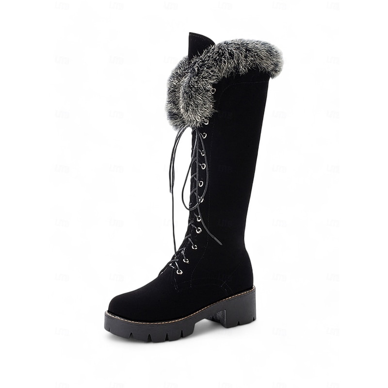 More information about Women's Faux Suede Knee-High Lace-Up Boots with Faux Fur Cuffs – Stylish Winter Footwear with Chunky Sole