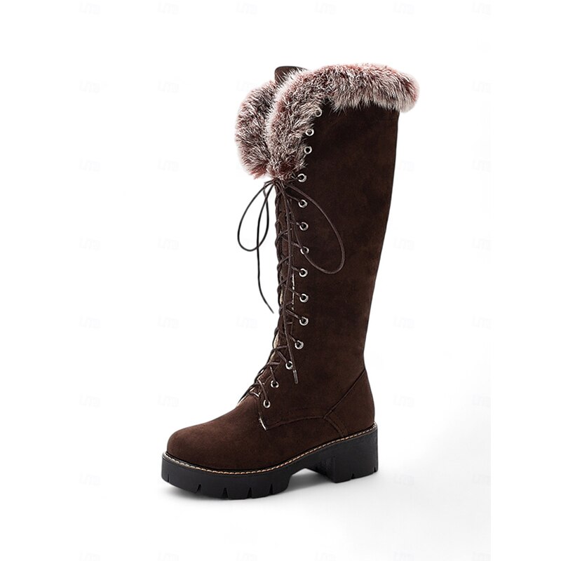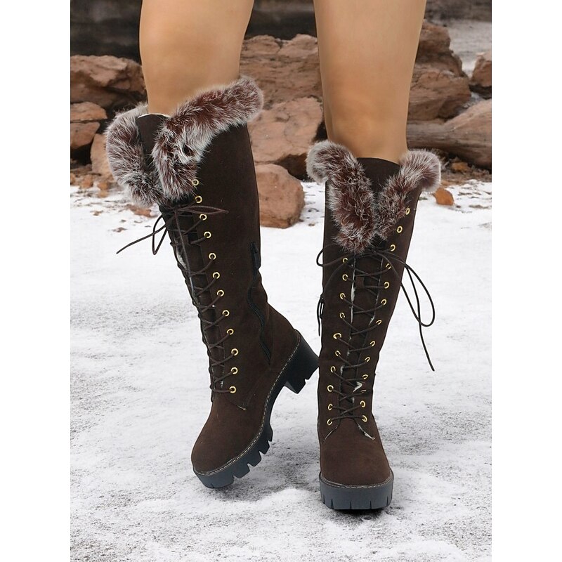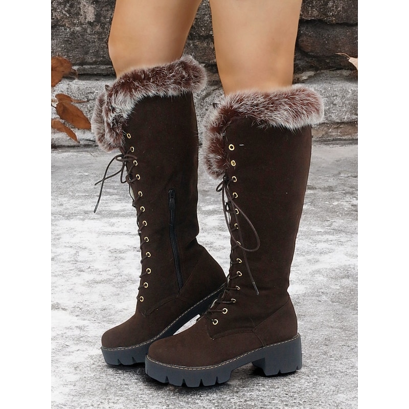 Women's Faux Suede Knee-High Lace-Up Boots with Faux Fur Cuffs – Stylish Winter Footwear with Chunky Sole 17