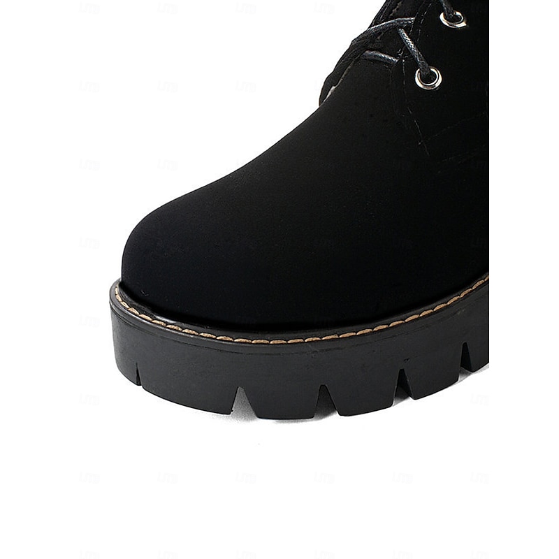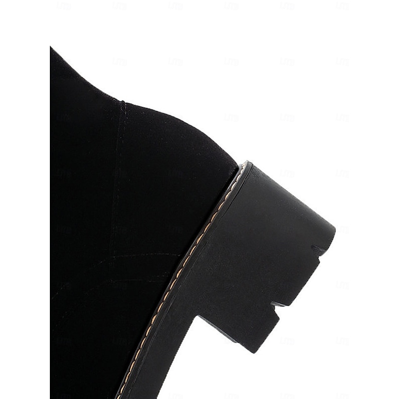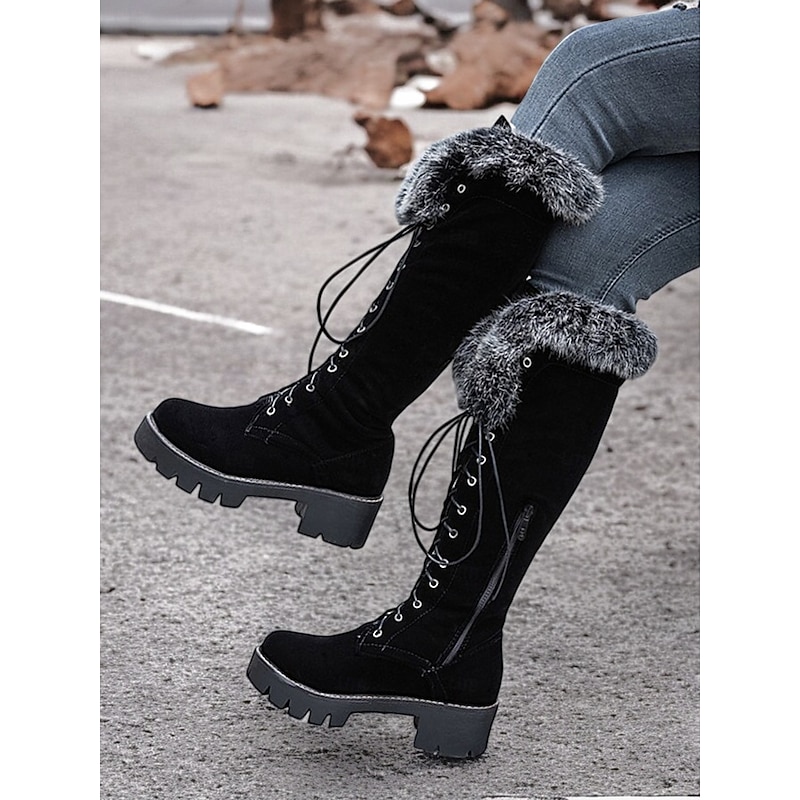 Highlights [Fabric & Material] Crafted from high-quality faux suede and adorned with plush faux fur cuffs, these knee-high boots provide a luxurious and velvety texture. The use of these materials ensures both style and warmth, making them ideal for colder seasons. [Design & Fit] Featuring a knee-high structure, these boots offer extra coverage and warmth, with a snug lace-up design accompanied by metallic eyelets for an adjustable fit. The chunky heel and platform provide a slight elevation while ensuring comfort and support for all-day wear. [Design Highlights] The elegant faux fur trim at the top of the boots adds a sophisticated touch and enhances insulation. The sturdy rubber outsole with a rugged, deep tread pattern enhances grip and stability, perfect for navigating snowy or icy terrains. [Occasions] These versatile boots are suited for various winter occasions, from daily errands to casual outings. The stylish yet practical design makes them a perfect choice for those aiming to combine fashion with function during the colder months. [Size Guide] Available in a range of sizes from US5.5 to US10.5, these boots cater to a variety of foot sizes, ensuring a comfortable fit for all.