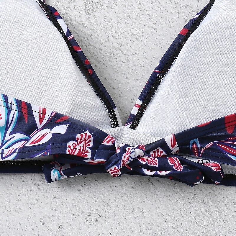 : The bikini features a halter neckline and a distinctive V wire at the bust for a modern, sexy look. The top is padded, offering enhanced support and a push-up effect. The open-back design adds to its allure, while the cheeky bottom provides moderate coverage, complementing the overall tropical and holiday style.