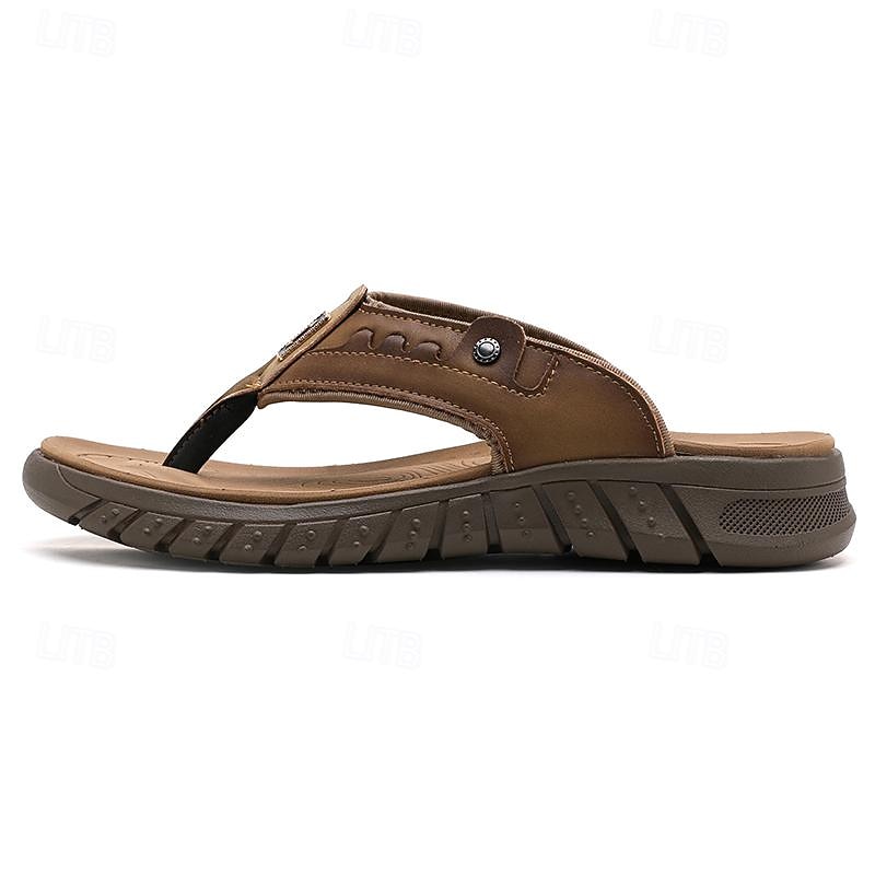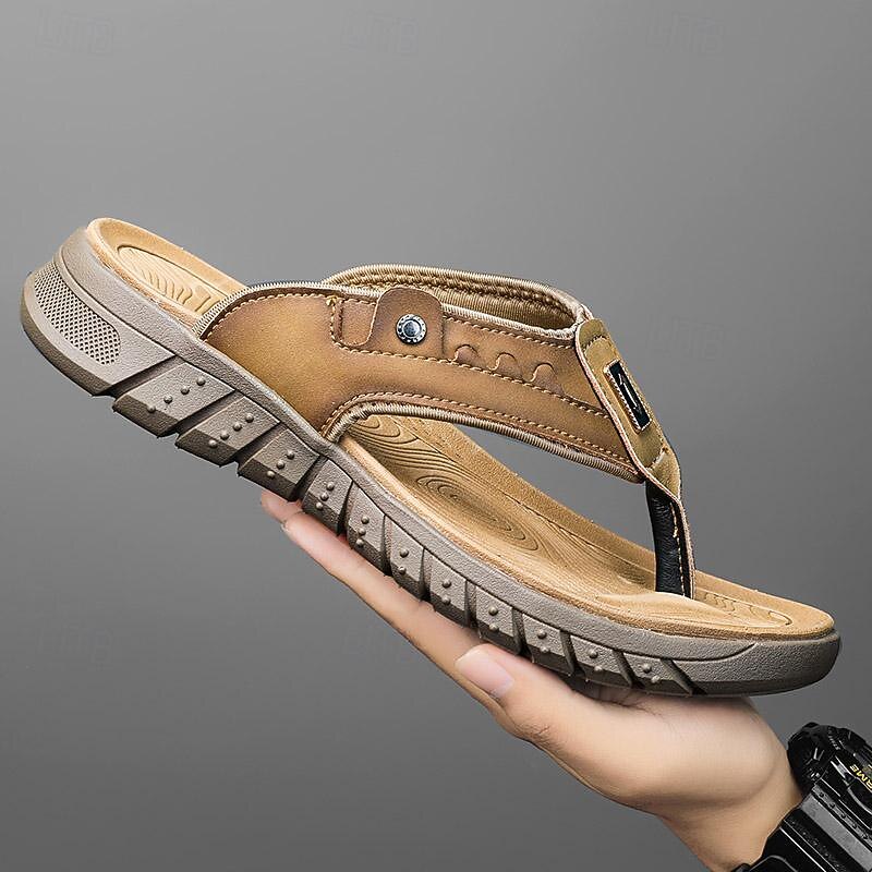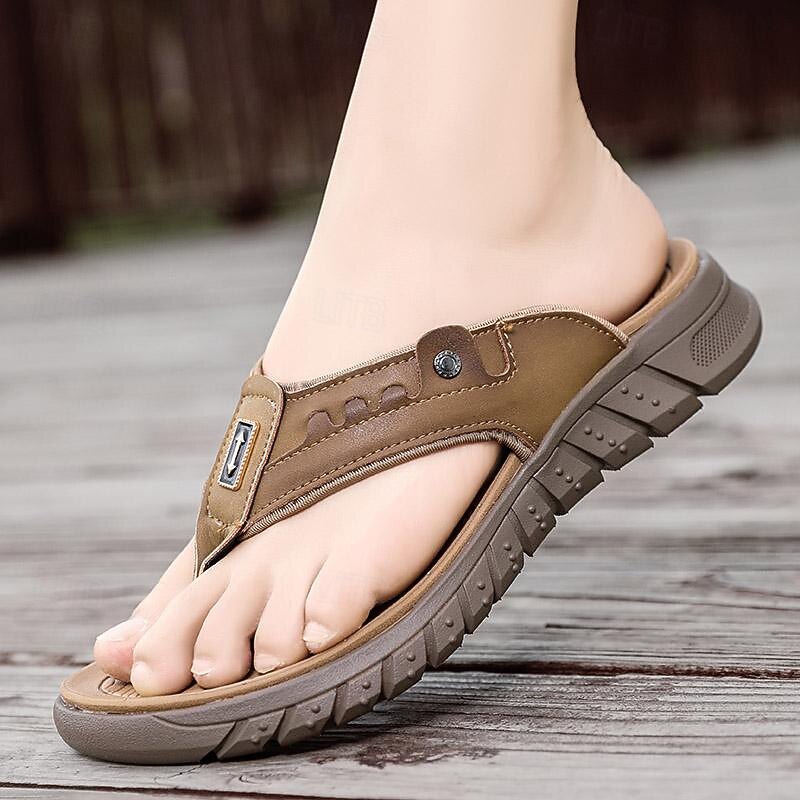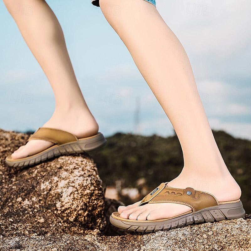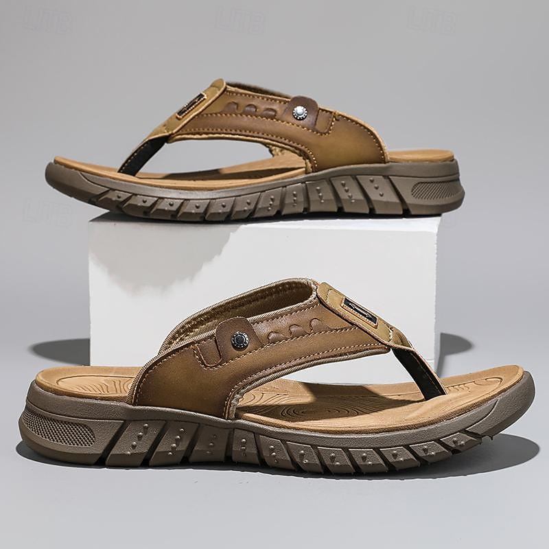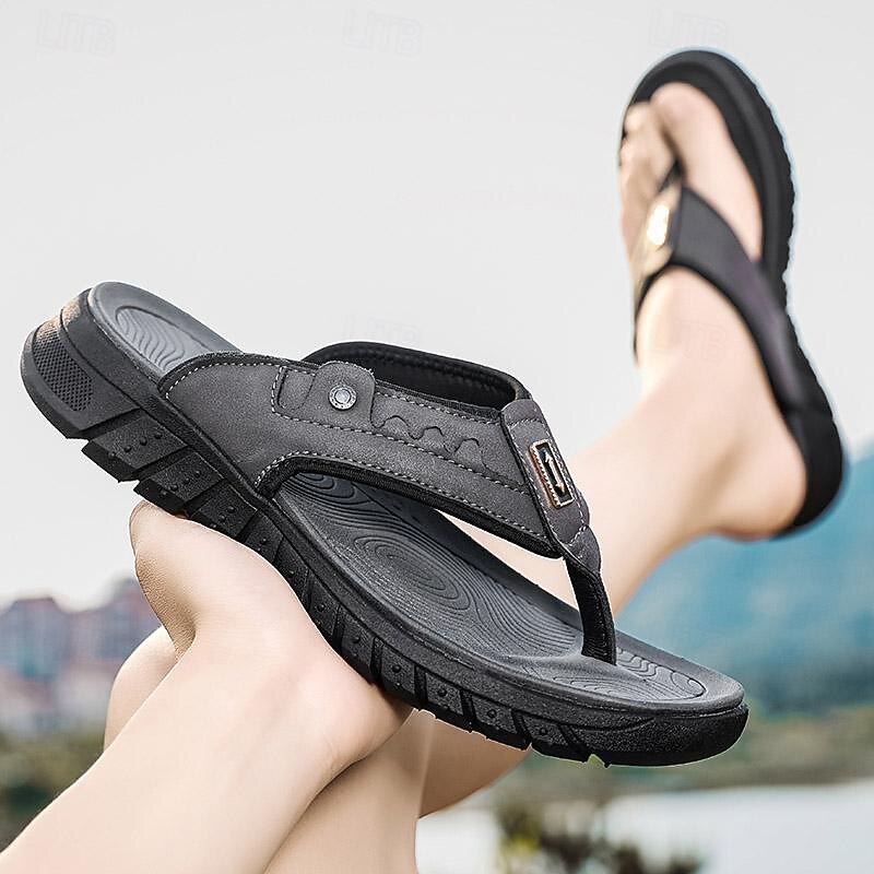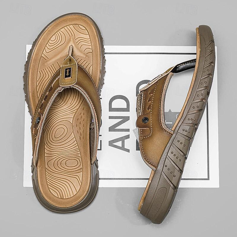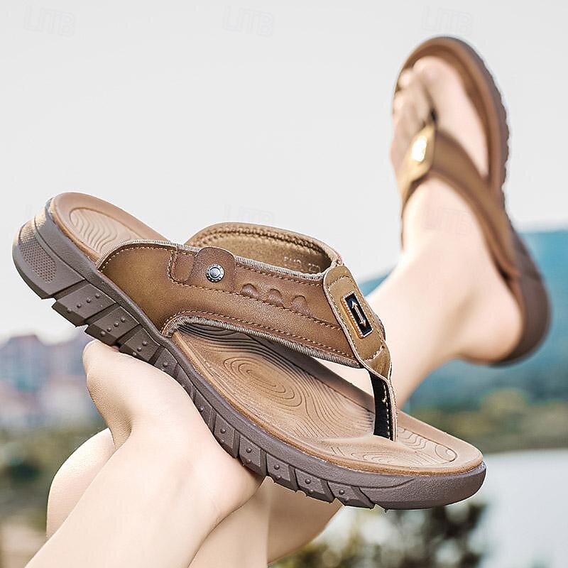 Highlights [Fabric & Material] These men's sandals are crafted with high-quality leather uppers, providing a refined and durable finish that is easy to maintain. The outsole is made from robust rubber, offering excellent grip and slip resistance. [Fit & Style] Featuring an ergonomically contoured footbed, these sandals deliver superior support and cushioning for prolonged wear. The casual style is complemented by a thong-style strap with an adjustable buckle, ensuring a custom fit for various foot shapes. [Design Highlights] The sandals boast a splicing embellishment and a classic round toe shape, merging retro aesthetics with modern functionality. The simple, solid-colored design makes them versatile for different outfits. [Occasions & Usage] Perfect for summer days, these sandals are ideal for vacation getaways, daily wear, beach outings, and leisurely walks. They combine practicality with stylish aesthetics, making them suitable for a range of casual occasions. [Size Range & Suggestions] Available in a size range from US6 to US10, these sandals adhere to standard sizing, making it easy for you to select your usual size with confidence.