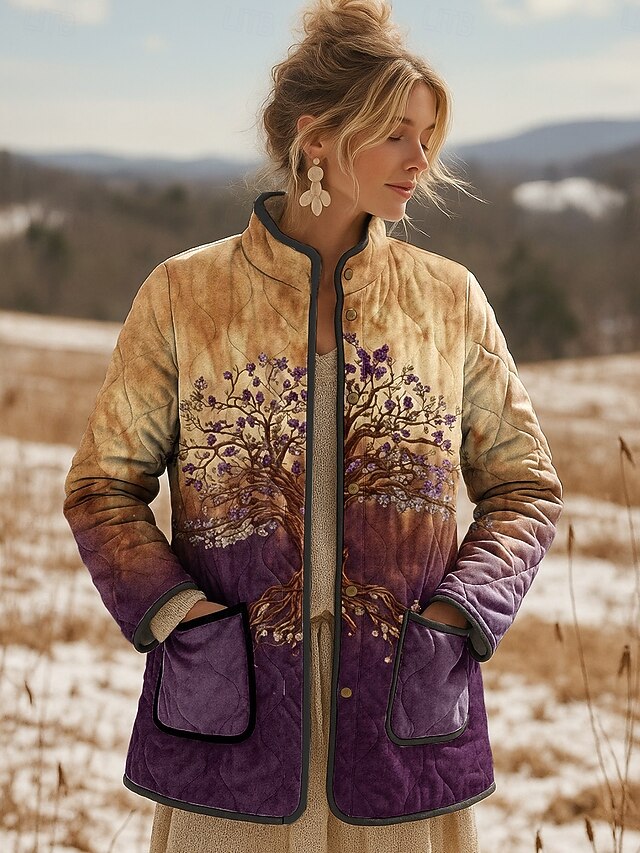 Women's Winter Jacket Quilted Jacket Warm Lightweight Print Elegant Vintage Boho Vintage Vacation Home Casual Regular Stand Collar Regular Fit Long Sleeve Outerwear Yellow Light Purple Purple Fall 24
