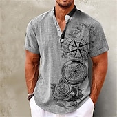 Highlights [Fabric]: This men's shirt is crafted from a high-quality polyester fabric, designed to offer a lightweight and breathable wear, perfect for both spring and summer seasons. Its fabric composition ensures durability and easy maintenance, making it an ideal choice for frequent use. [Fit]: Designed with a regular fit, this shirt provides comfort with a relaxed silhouette. The short sleeves and stand collar add to its laid-back style, making it suitable for casual outings or beachwear. [Design Highlights]: The shirt features an intricate graphic print that includes a vintage-inspired compass and blooming rose motif, exuding a nautical charm. The modern half-button placket and mandarin collar add a contemporary twist to its classic design. [Occasions]: This versatile shirt is perfect for vacations, outdoor adventures, or everyday wear. Its casual and fashionable style makes it suitable for a variety of occasions, providing both comfort and a stylish statement. [Size Range]: Available in a wide range of sizes, including S, M, L, XL, XXL, and 3XL, ensuring a perfect fit for different body types. With colors like Blue, Green, Pink, Gray, and Khaki, you can choose the shade that best suits your style.