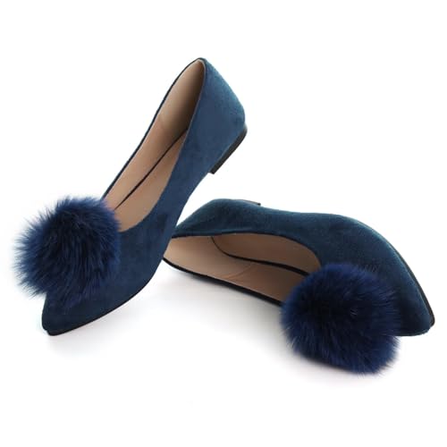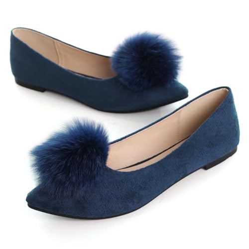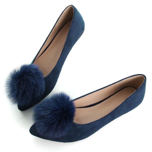 LUXINYU Women's Comfortable Fuzzy Suede Low Heel Pointed Toe Mary Jane Flats Fashion Puff Pompom Dress Shoes Slip On Casual Office Shoes 7