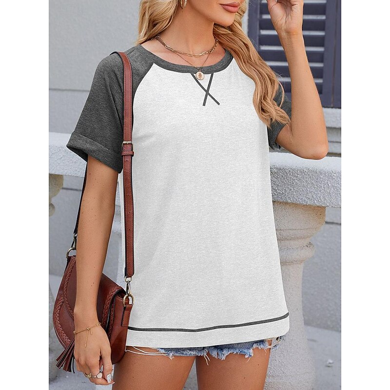 Women's T Shirt Color Block Casual Short Sleeve Crew Neck Long Tops Daily Print White Wine Gray Summer 2
