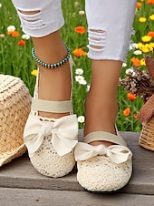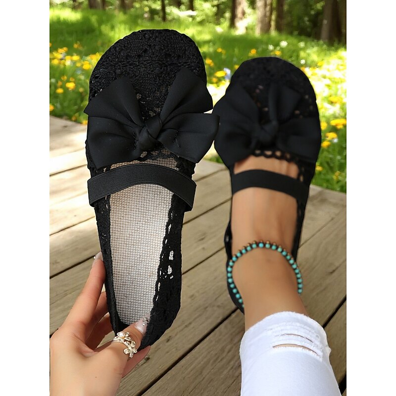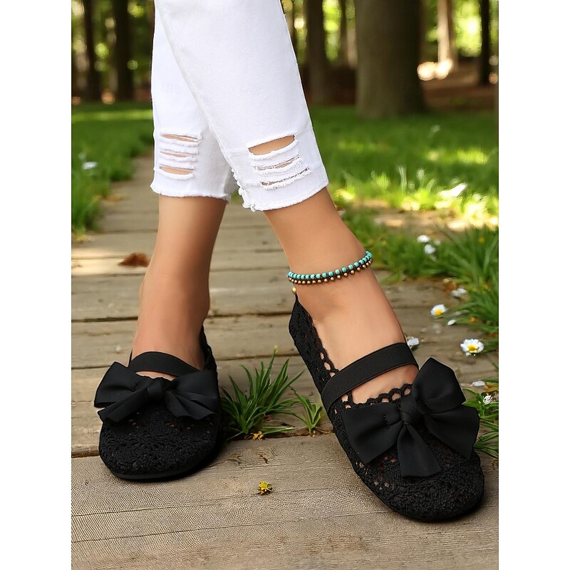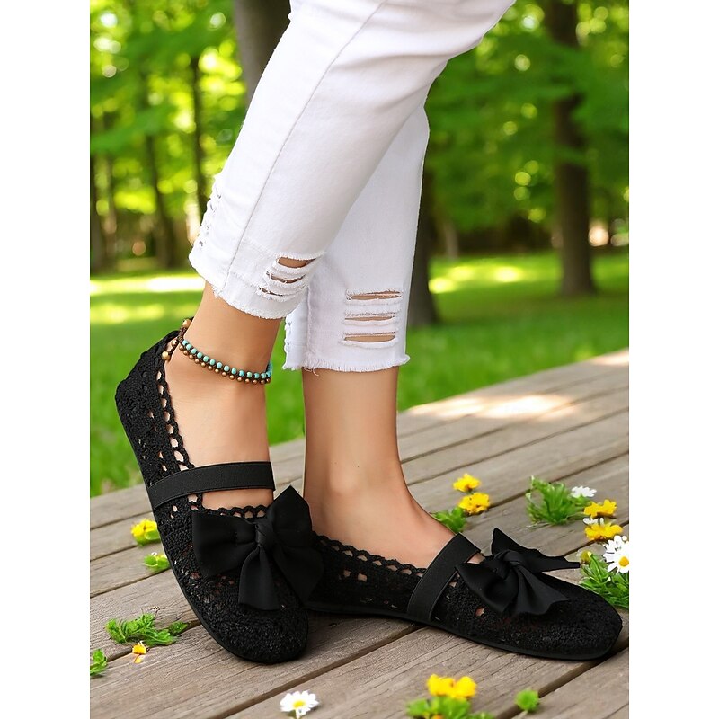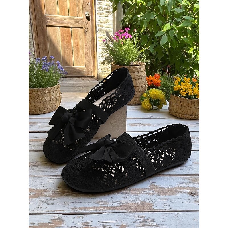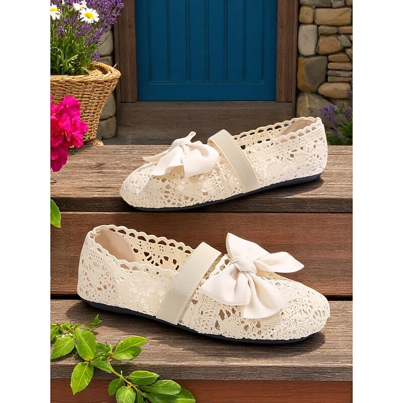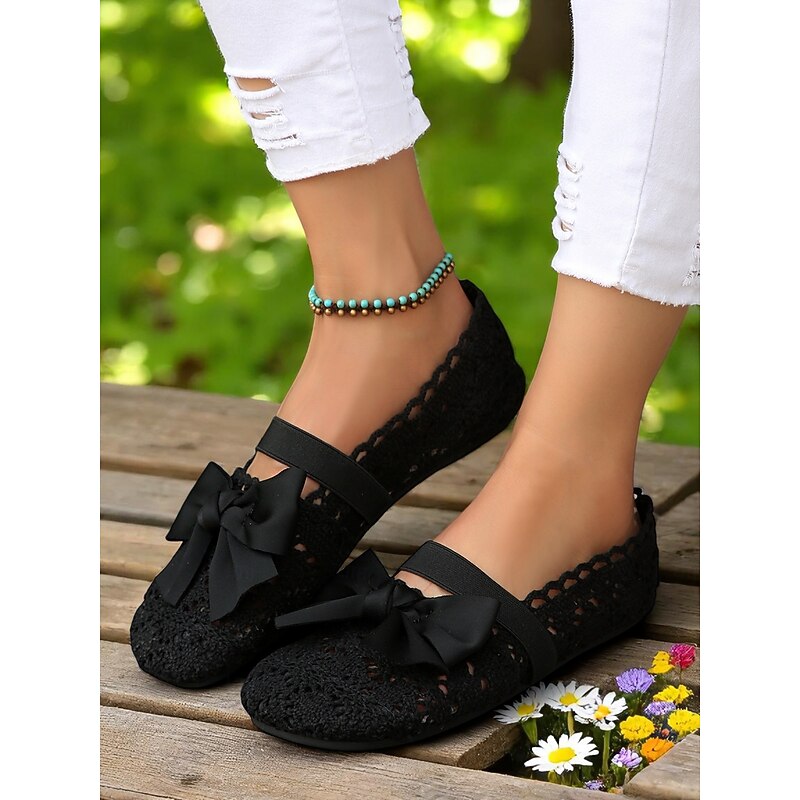 HOT ! Women's Wide Width Crochet Lace Flats with Bow – Lightweight Romantic Style for Garden Dates, Summer Picnics and Casual Outdoor Events