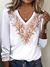 More information about Women's T Shirt Floral Graphic Plants Vintage Stylish Classic Long Sleeve V Neck Regular Tops Daily Embroidered Print White Spring Fall Winter