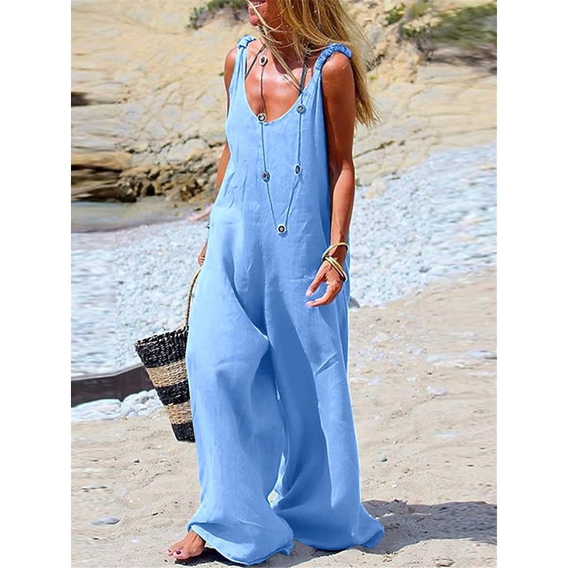 Highlights [Fabric]: Crafted from a lightweight and breathable polyester fabric, this women's jumpsuit offers a micro-elastic fit that ensures all-day comfort and ease of movement. [Fit]: The jumpsuit features a regular fit with wide leg openings for a relaxed and effortlessly chic look. Its sleeveless style and wide shoulder straps provide a hint of sophistication, perfect for embracing the summer breeze. [Design Highlights]: With a deep V-neckline, this piece presents a contemporary style that lends itself well to layering with necklaces or accessorizing with hats and bags. The slight gather on the shoulder straps adds a subtle touch to the minimalist design. [Occasions]: Ideal for casual streetwear, daily outings, and weekend getaways, this jumpsuit combines practicality and fashion. It's an excellent choice for summer activities, offering versatility for various occasions. [Size]: Available in a range of sizes from S to 3XL, this jumpsuit caters to diverse body types, ensuring a comfortable fit for everyone.