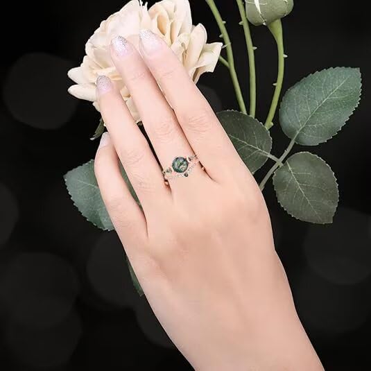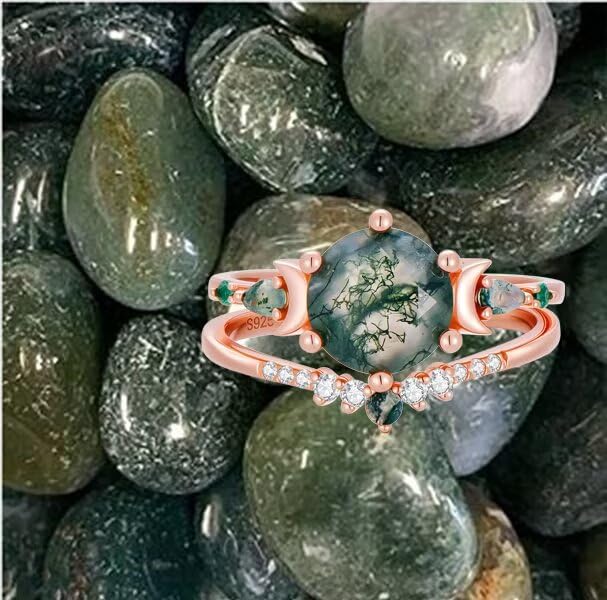 More information about Natural Moss Agate Engagement Rings Set for Women 925 Sterling silver with plated 18k rose gold 2CT Round Green Moon Leaf Art Deco Bridal Wedding Ring Set