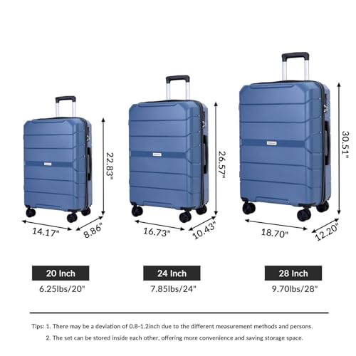 Lightweight Hardshell Luggage Set with Wheels - 3-Piece Blue Suitcase Set (20", 24", 28") for Travel 6