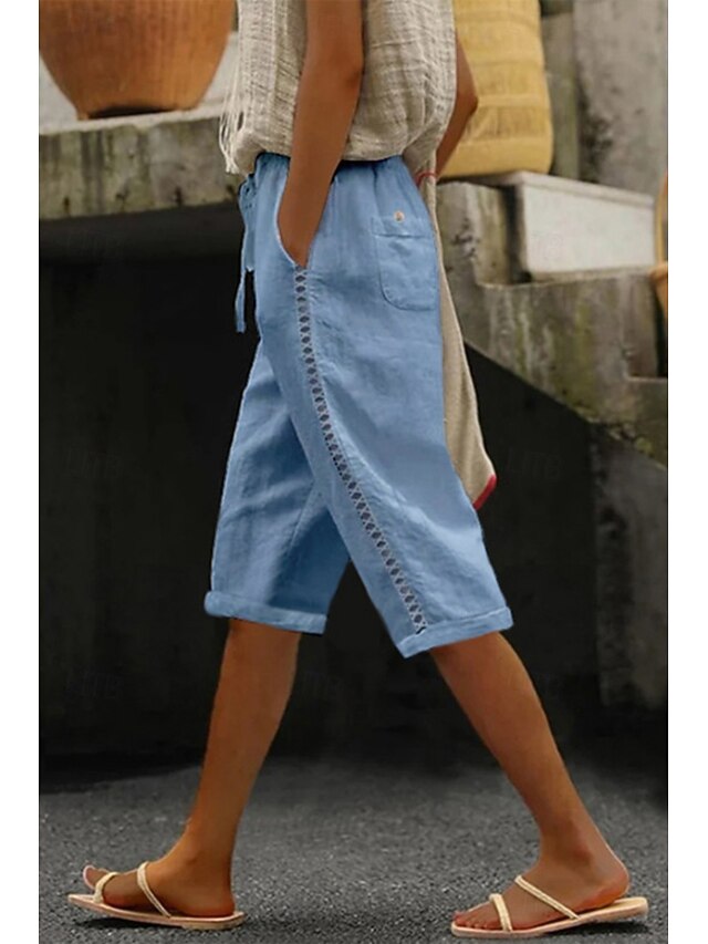 HOT ! Women's Cotton Linen Pants Slacks Crop Streetwear Casual Knee Length Natural Plain Pocket Elastic Drawstring Design Breathability Soft Micro-elastic Casual Daily Wear Light Sky Blue White Pink Summer