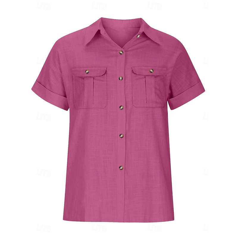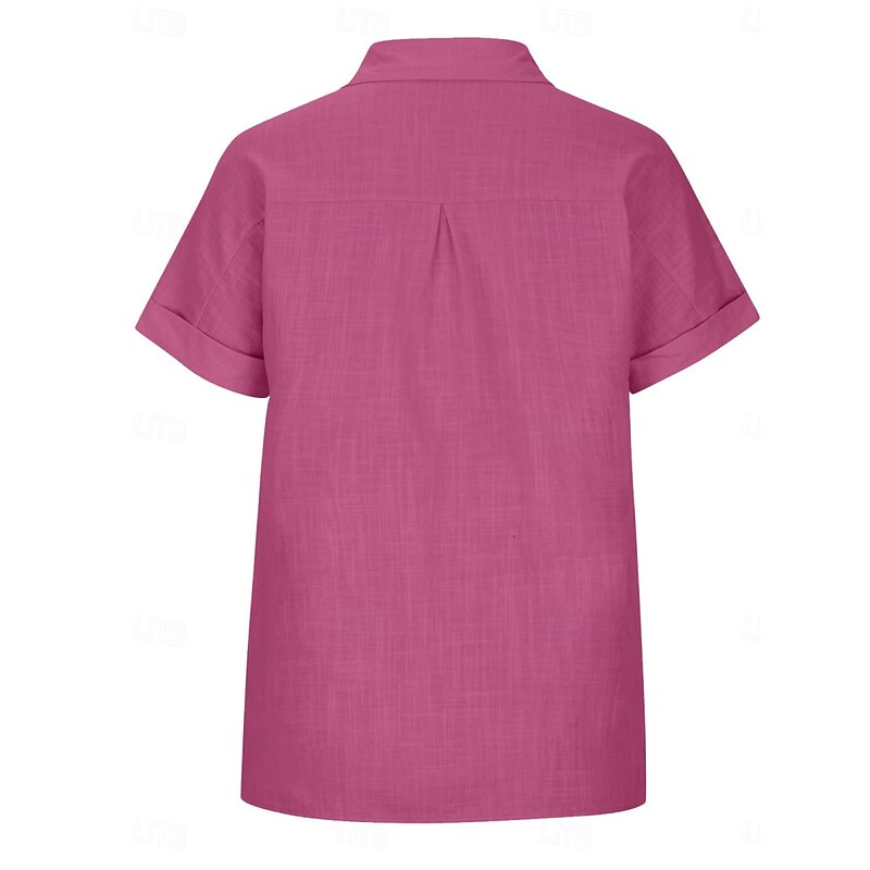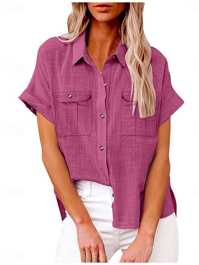 More information about Women's Shirt Cotton Linen Shirts Button Up Blouse Solid Color Stylish Casual Short Sleeve Shirt Collar Regular Tops Daily Buttons Pocket Silver Wine Army Green Rose Pink Summer