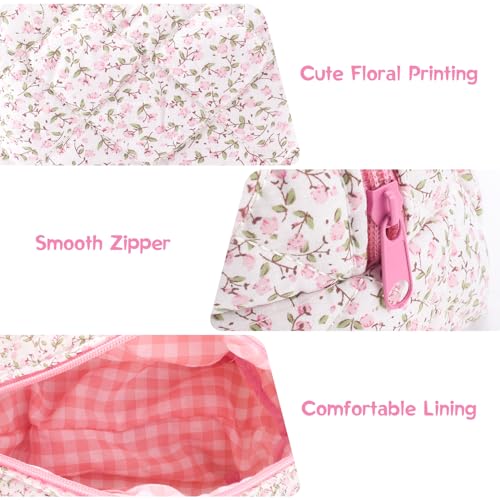 Quilted Makeup Bag Floral Large Cute Cosmetic Bag Cotton Puffy Makeup Organizer Coquette Travel Makeup Pouch Aesthetic Portable Zipper Toiletry Storage Bag for Women Girls (Pink) 6