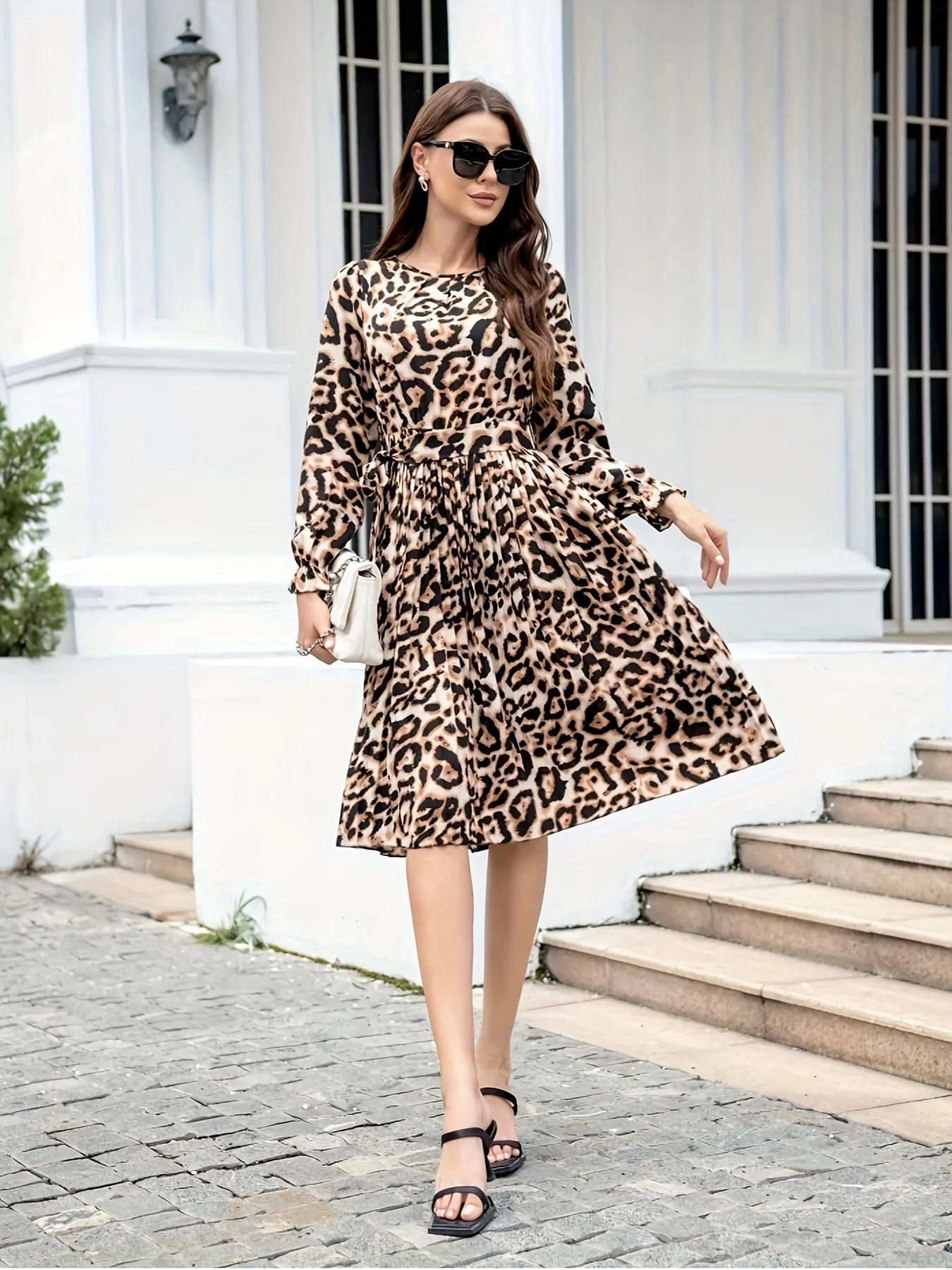 New leopard print round neck women's pleated waist lantern long sleeve dress. S-2X