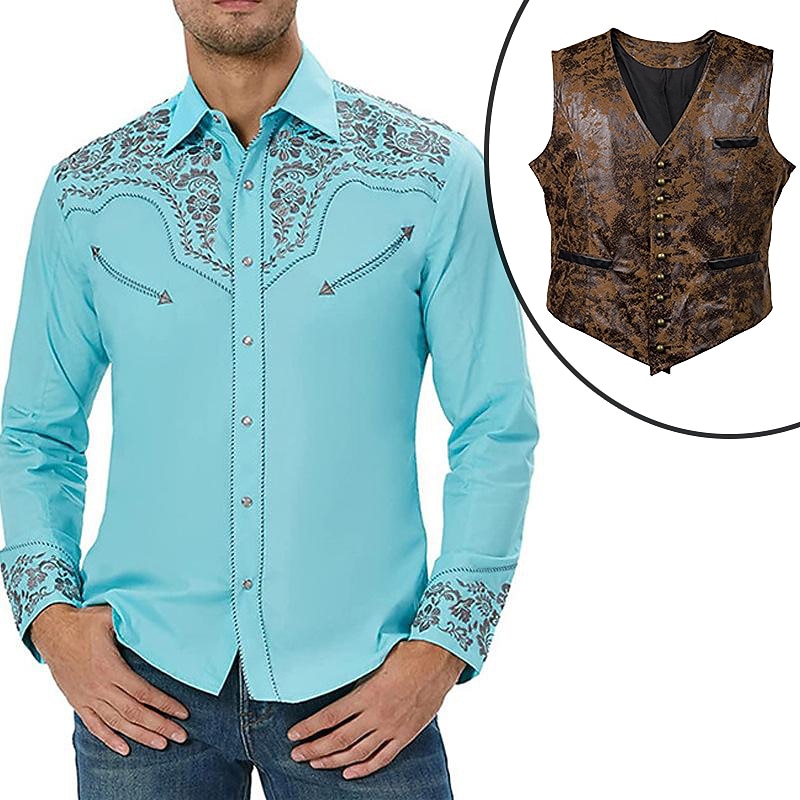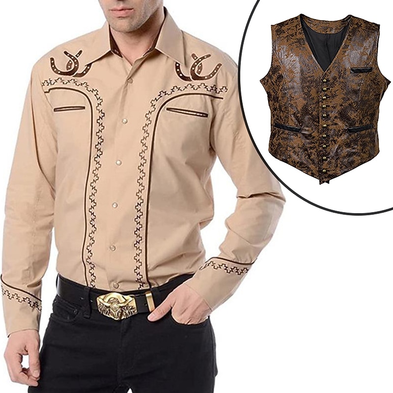 HOT ! Set with West Cowboy Shirt PU Waistcoat Vest Men's 2 PCS Outfits Long Sleeve Casual Button Down Shirt Retro Vintage Party Carnival Cosplay Costume