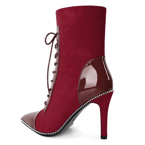 SAMMITOP Women's Lace Up Ankle Boots High Stiletto Heel Pointy Toe Fashion Heeled Booties Silver Beaded Side Zipper Short Boots Shoes 4 Inch 3