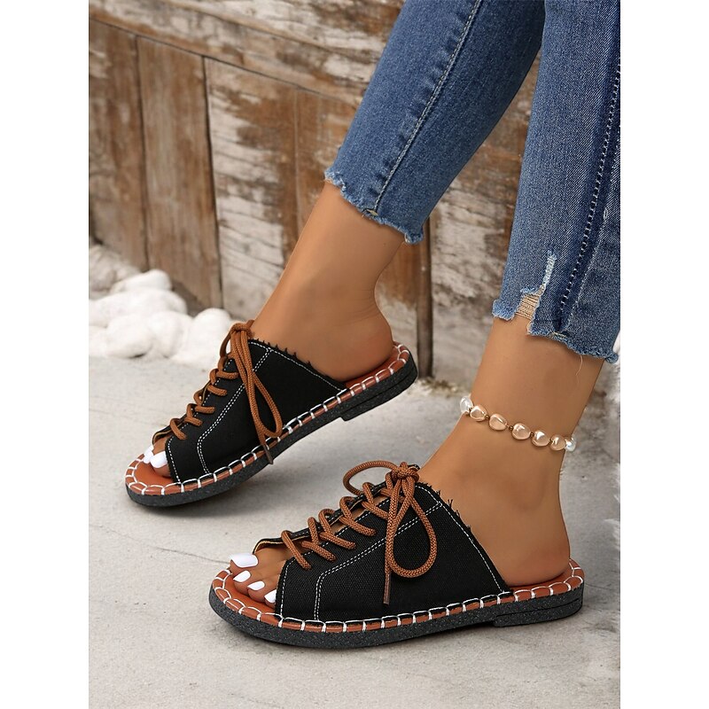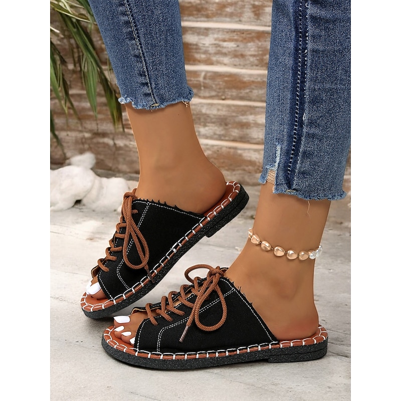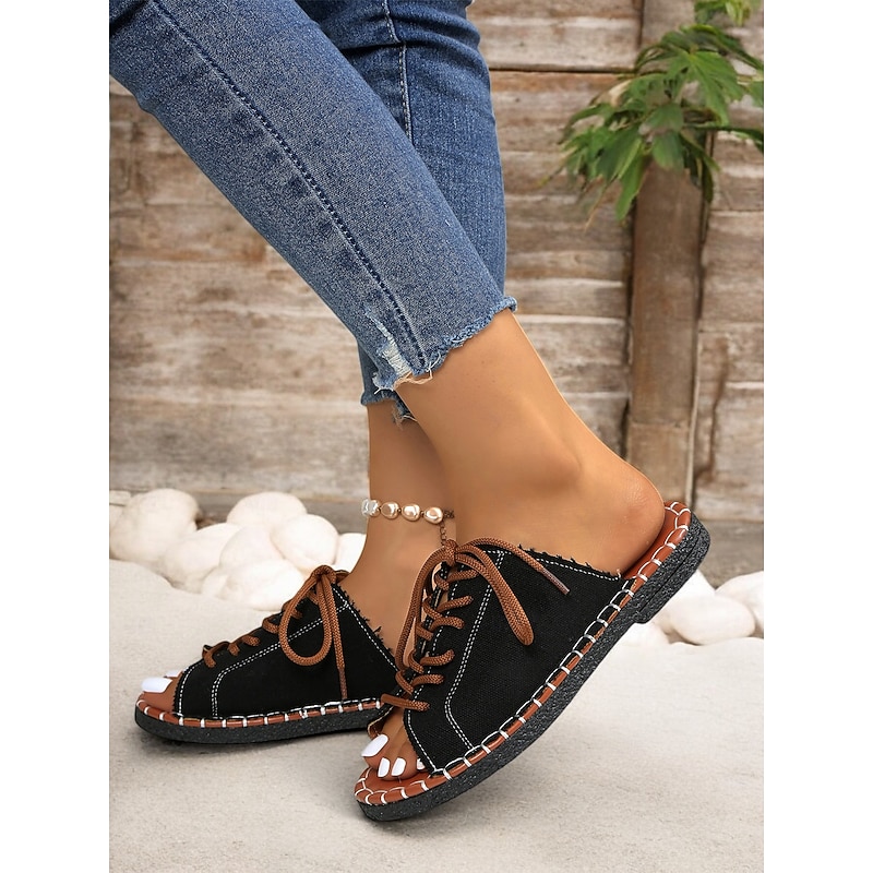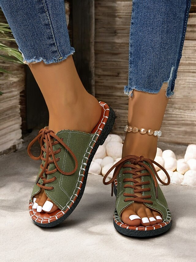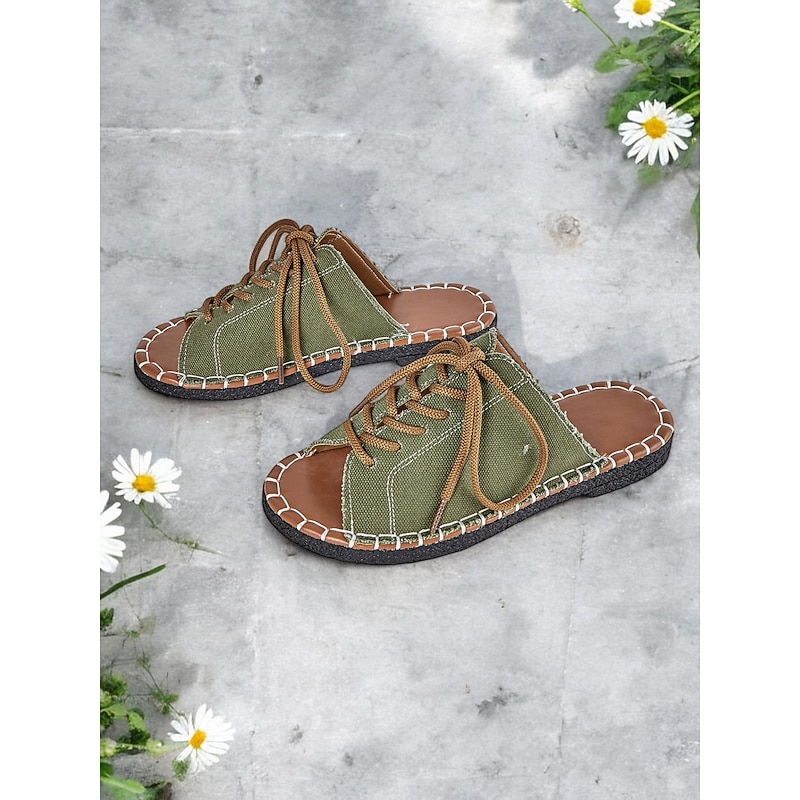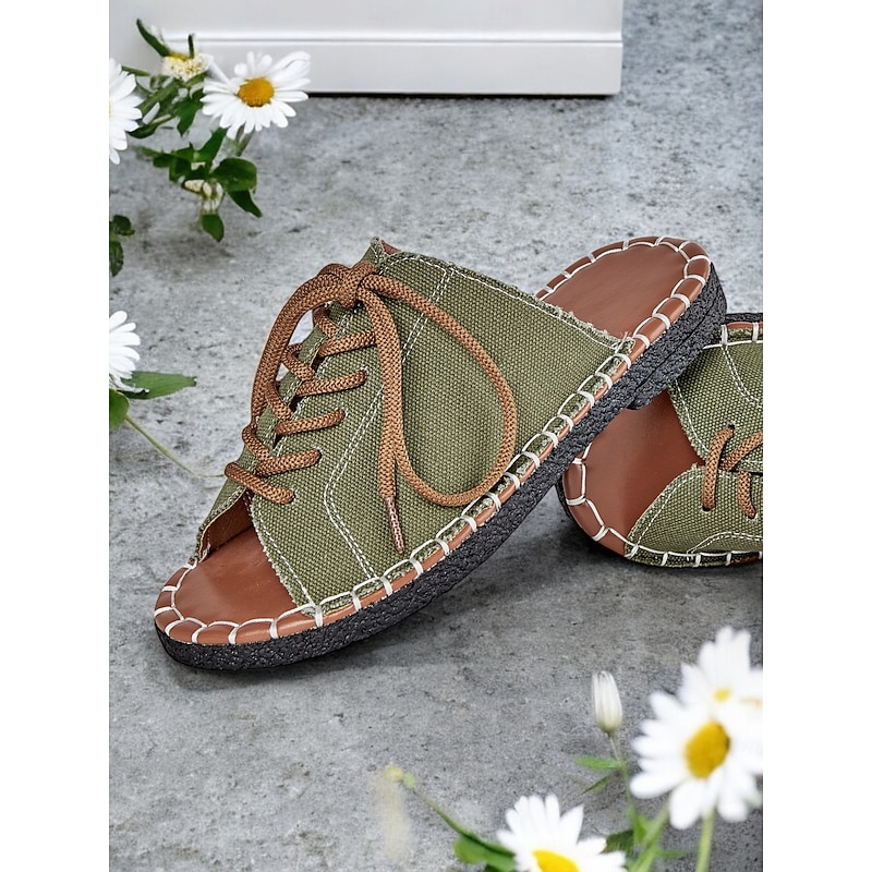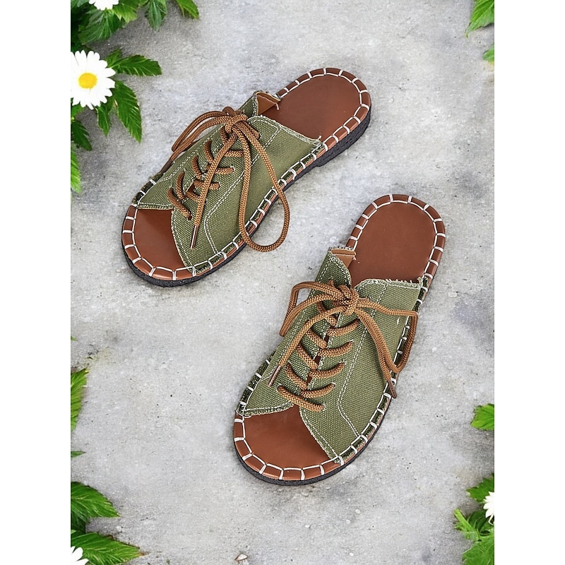 HOT ! Women's Green Open-Toe Lace-Up Canvas Sandals with Hand-Stitched Sole – Casual and Comfortable for Summer, Travel and Outdoor Activities