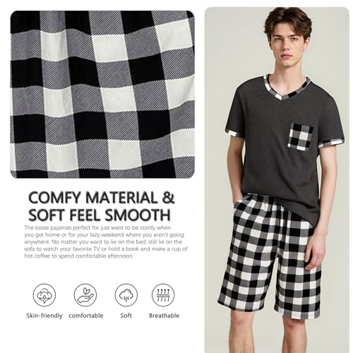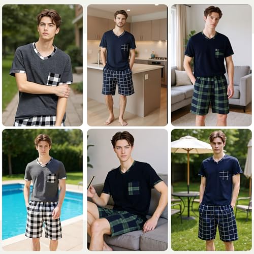 • 【Short Sleeve PJS Top】Men's soft pjs shirts features with left chest pocket. V-neck sleepwear can be easily put it on and off. Perfect to wear during daily, the pajama set for men give you a free and comfortable wearing experience. The mens summer pajamas set with various plaid designs make you more stylish
