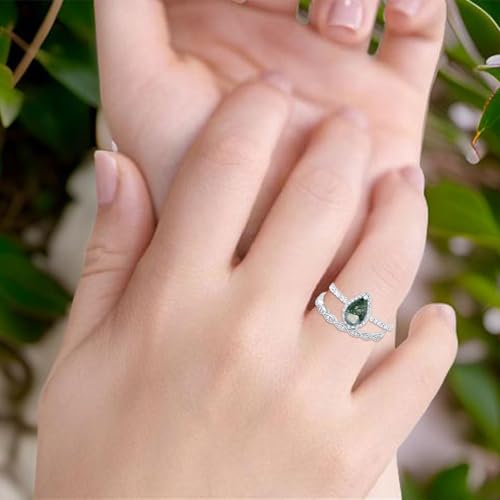 OMRANII Art Deco Two Piece Pear Teardrop Natural Green Moss Agate Vintage Style Halo CZ Wedding Set Engagement Bridal Ring 925 Sterling Silver 6