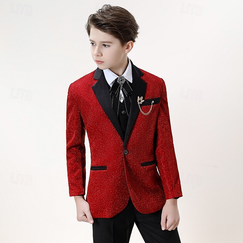 4 Pieces Ring Bearer Suit Boys Kids Suit Formal Suit Blazer & Pants & Shirts & Tie Formal Party Valentines Fashion Cool Solid Color Pocket Wine Polyester 9