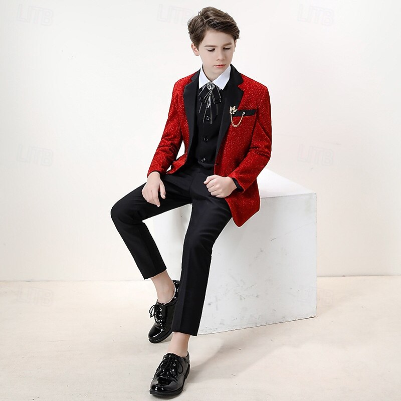 4 Pieces Ring Bearer Suit Boys Kids Suit Formal Suit Blazer & Pants & Shirts & Tie Formal Party Valentines Fashion Cool Solid Color Pocket Wine Polyester 6