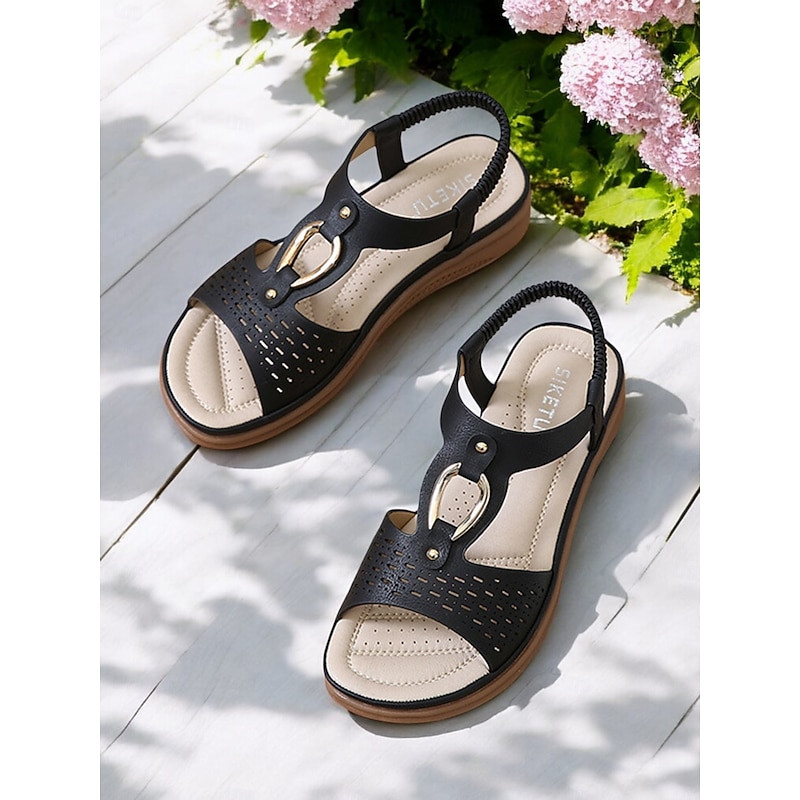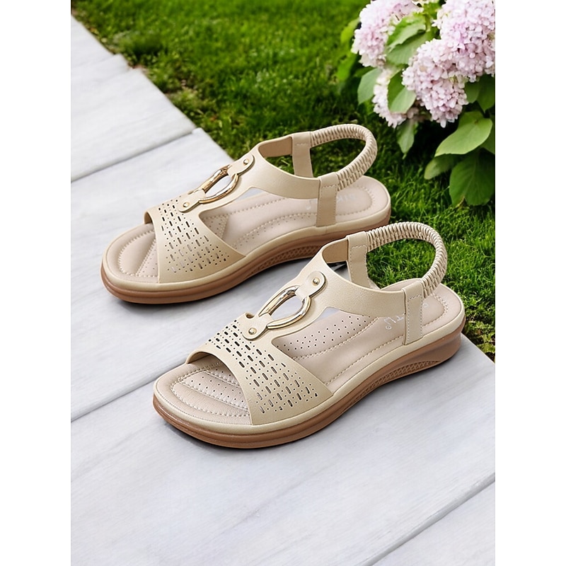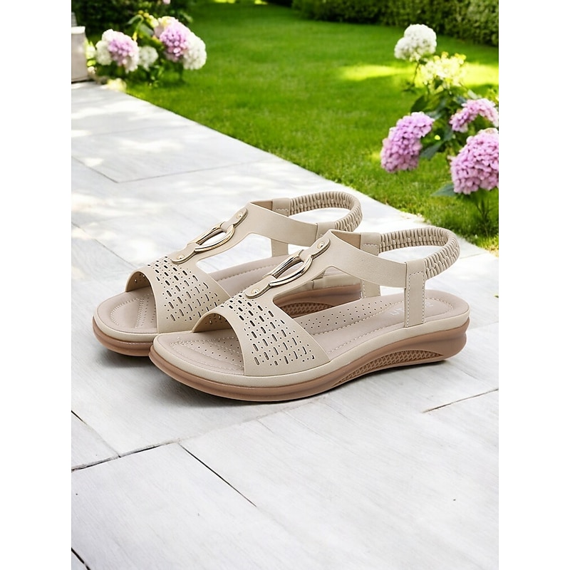 HOT ! Women's Cutout Slip-On Comfort Sandals - Open-Toe Flat Sandals with Metal Accent for Casual & Outdoor Wear