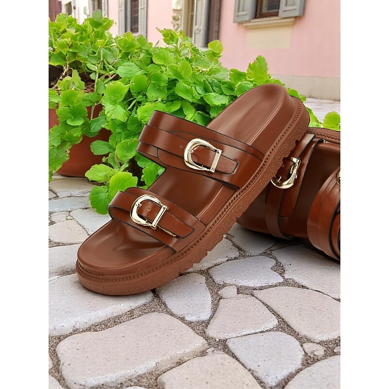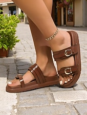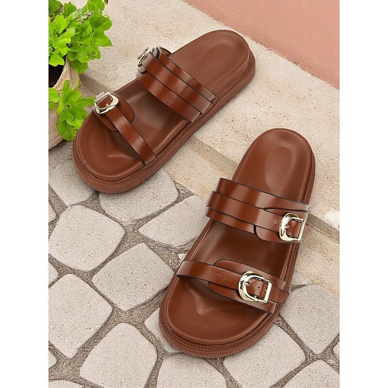 More information about Women's Black Buckle Sandals - Trendy Double Strap Design, Comfortable Footbed for Daily Wear and Relaxed Casual Style