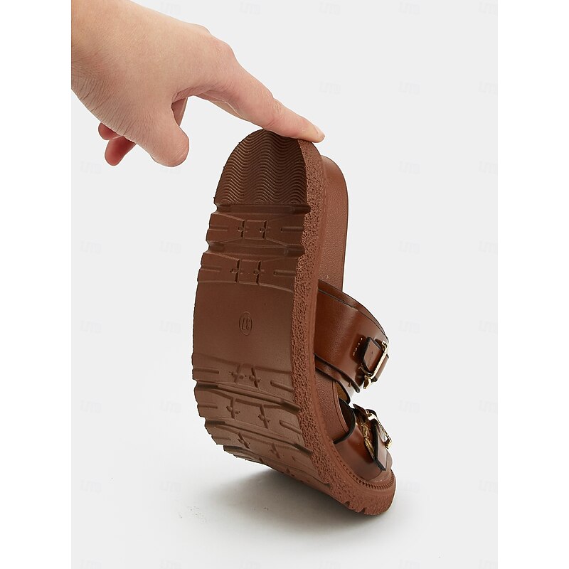 Highlights - Sleek faux leather upper - Stylish buckle embellishment - Classic round toe shape - Trendy open toe design - Durable rubber outsole for long-lasting wear