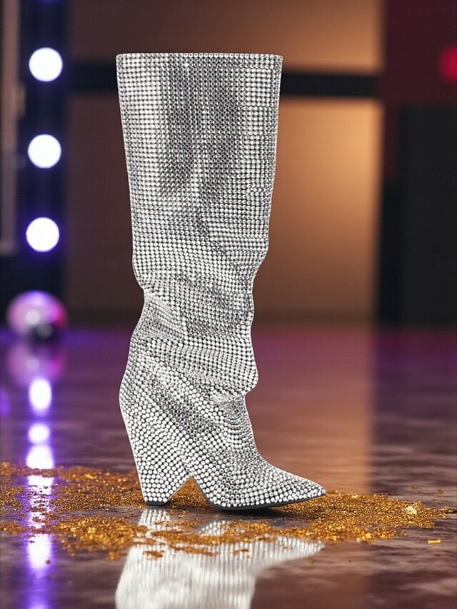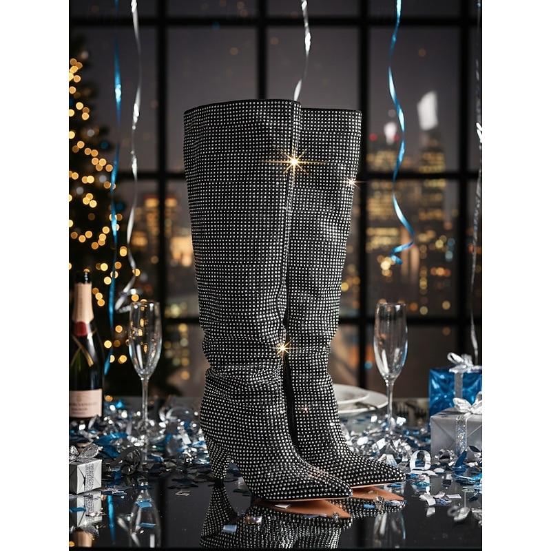 Women's Rhinestone Knee High Boots with Pointed Toe and Chunky Heel Sparkly Slouch Style Footwear for Christmas and New Year City Parties 1