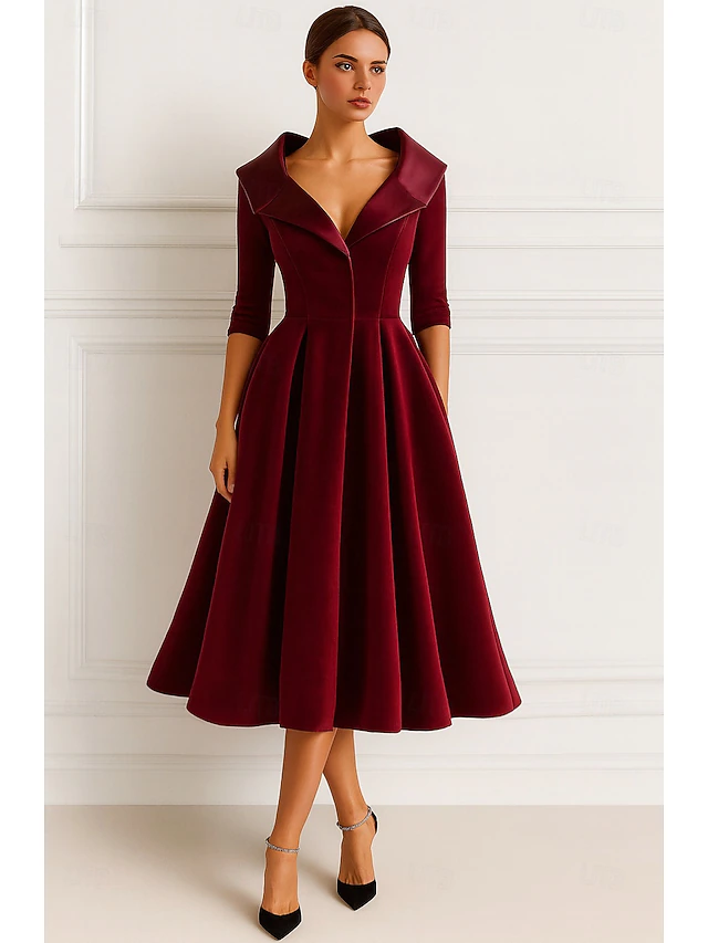 Red Black portrait collar A-Line Mother of the Bride Dress Elegant Vintage Tea Length Velvet Long Sleeve with Ruching Solid Color 1