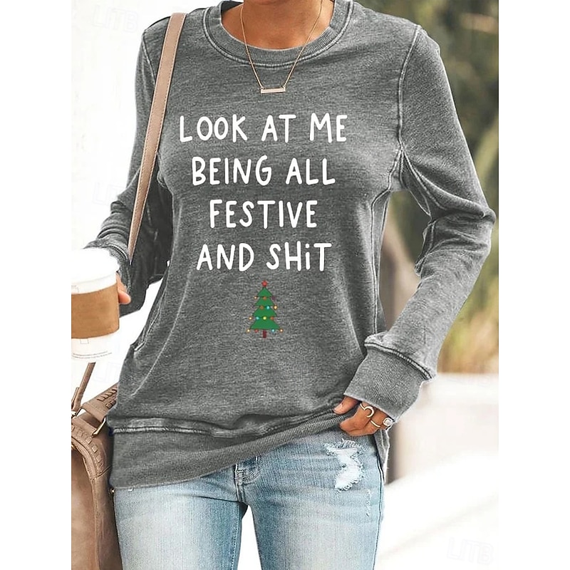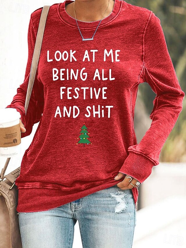 Women's Pullover Sweatshirt Graphic Tree Letter Casual Long Sleeve Crew Neck Regular Tops Street Casual Holiday Print Black Pink Red Green Gray Spring Fall Winter 11
