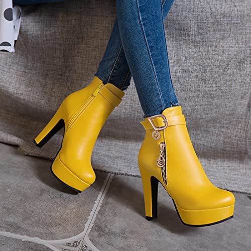 VOKLIN Women's Fashion Buckle Platform Block High Heel Ankle Boots Round Toe Side Zipper Dress Short Booties 5