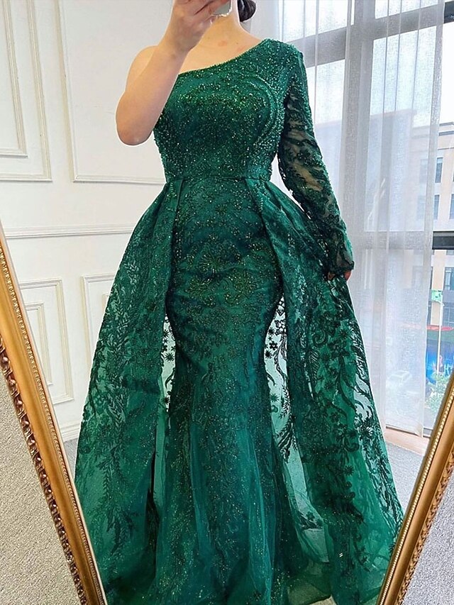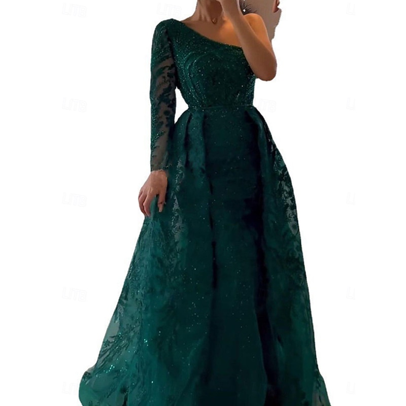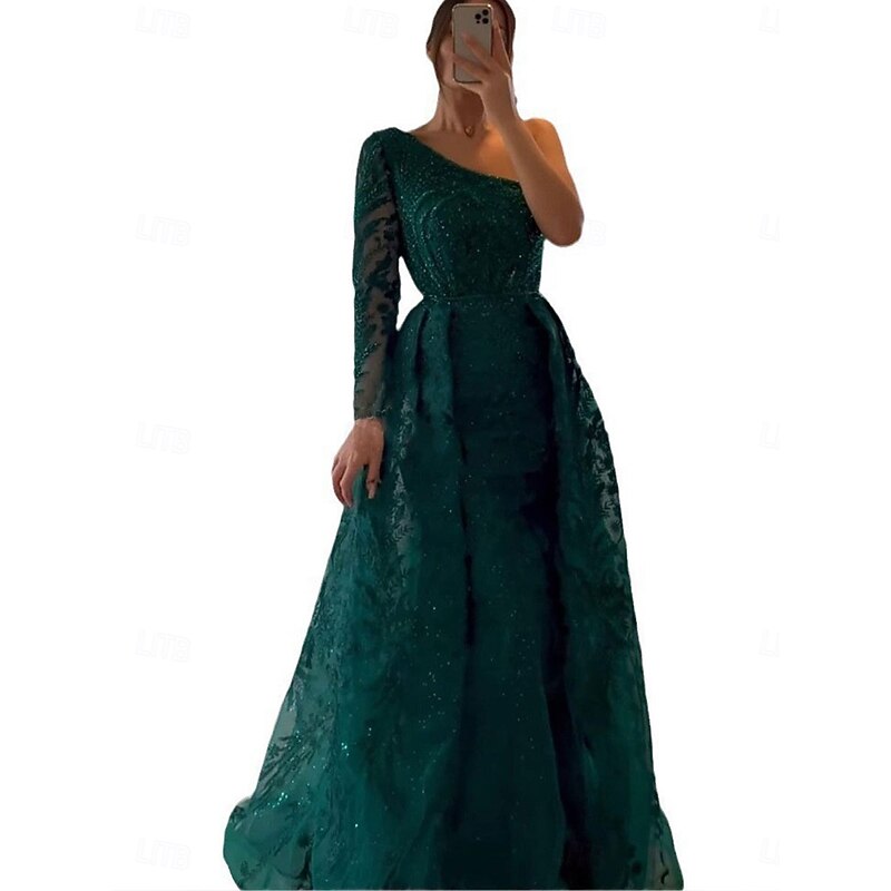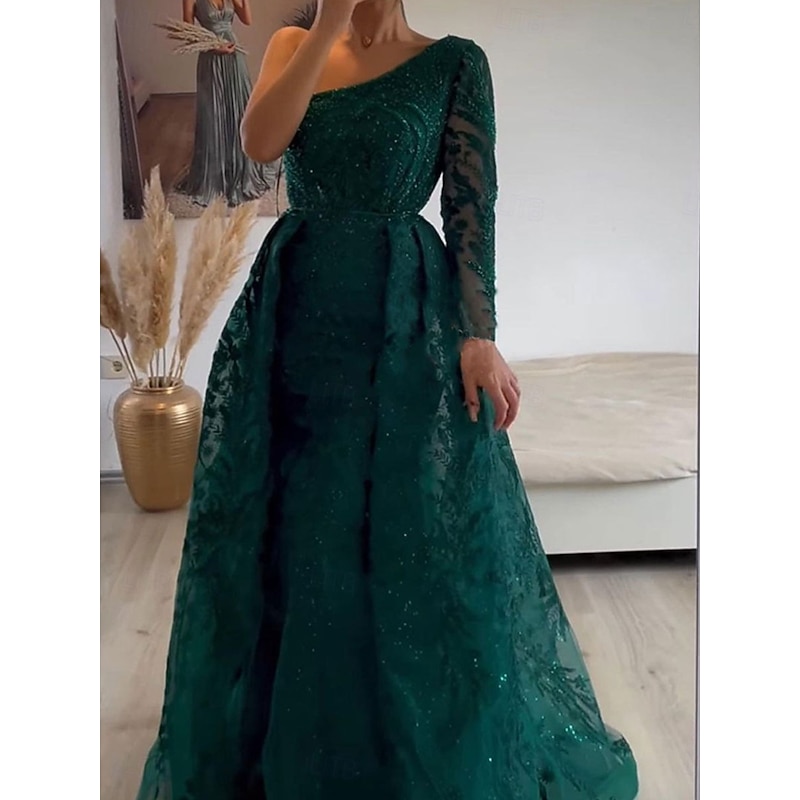 More information about A-Line Evening Gown Elegant Dress Formal Wedding Floor Length Long Sleeve One Shoulder Lace with Sequin