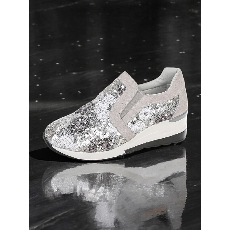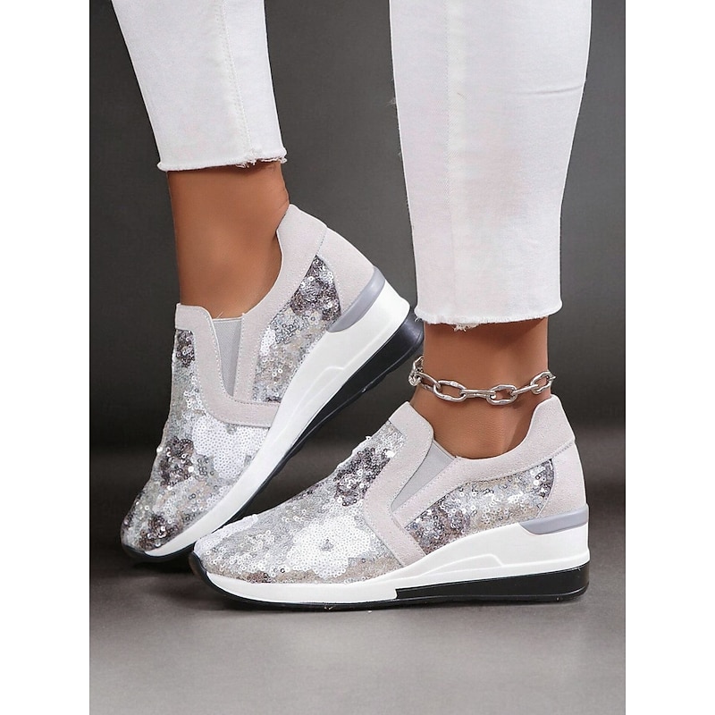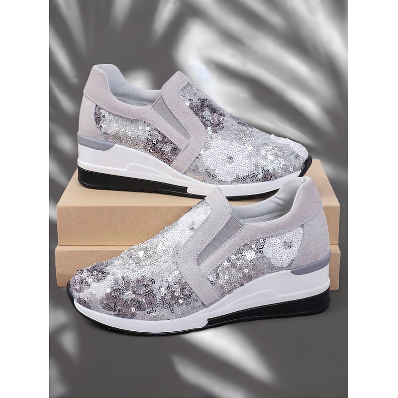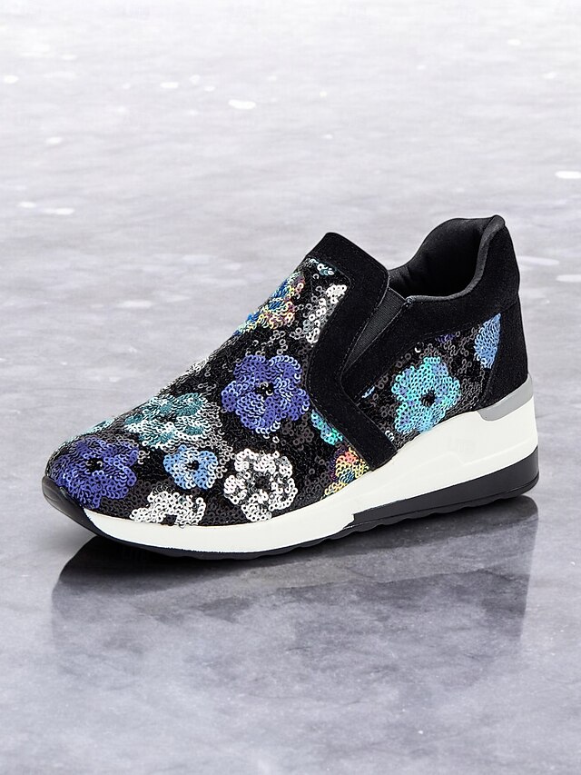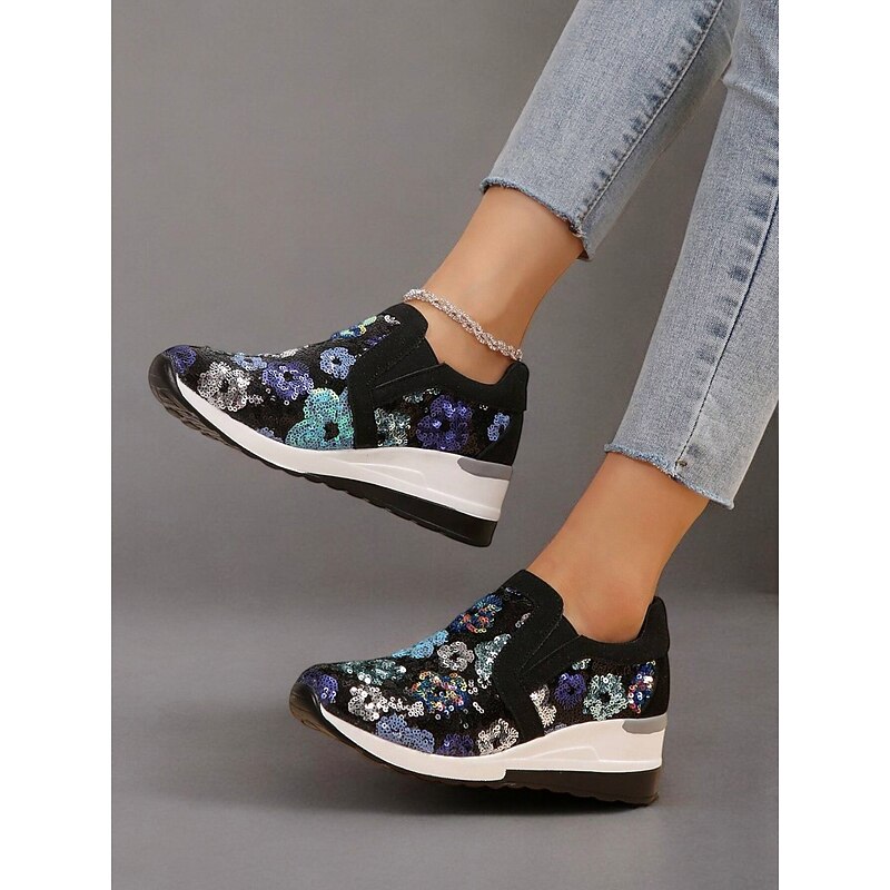 Highlights [Fabric and Materials] These sneakers feature a chic combination of faux suede and cloth, embellished with sequins for a floral pattern that sparkles in hues of blue, purple, and white. The sequins reflect light beautifully, adding an element of glamour to your look. [Design and Fit] The slip-on style includes stretchy panels for a comfortable, snug fit, while the sturdy wedge sole offers excellent support and cushioning for all-day wear. With a round toe shape, these sneakers ensure a relaxed and stylish fit on any foot. [Design Highlights] The standout feature of these sneakers is their glittering floral sequin design that captures attention effortlessly. The sequins elevate the casual style, making the shoes a versatile choice for adding a touch of sparkle to everyday outfits. [Occasions] Perfect for daily outings or a night out with friends, these sneakers combine fashion and function seamlessly. Whether you're heading to a casual gathering or want to add shimmer to your everyday ensemble, these sneakers are an ideal choice. [Size Notice] Available in a range of sizes including US6 / EU36 / UK4 to US10.5 / EU42 / UK8.5, ensuring a good fit for a variety of foot sizes.