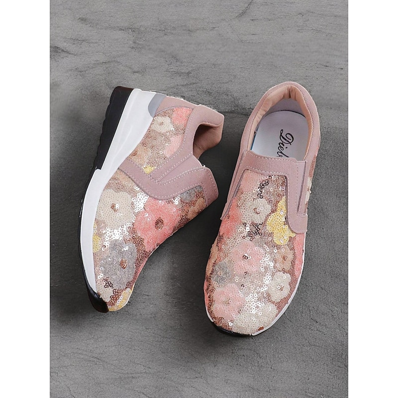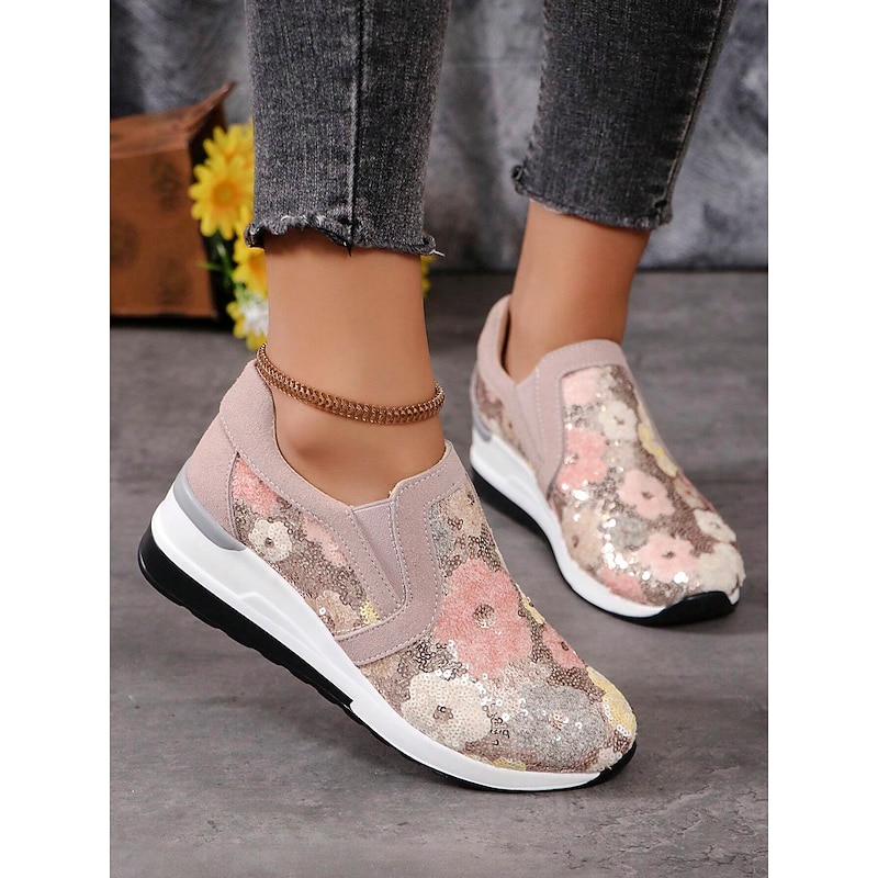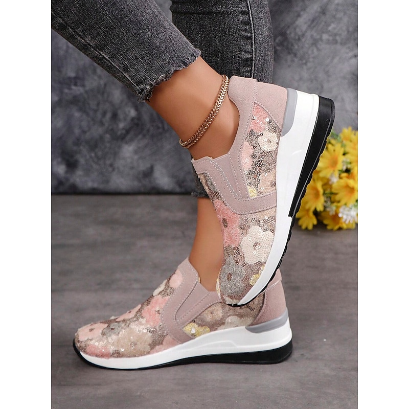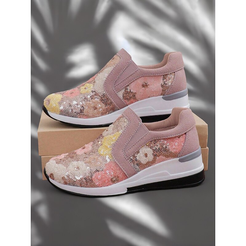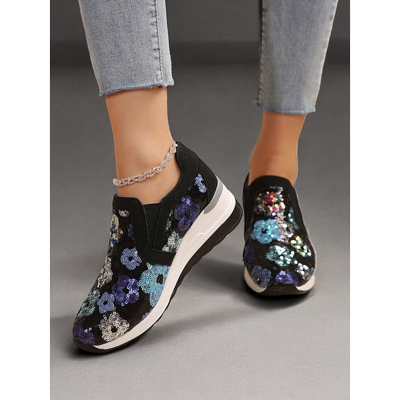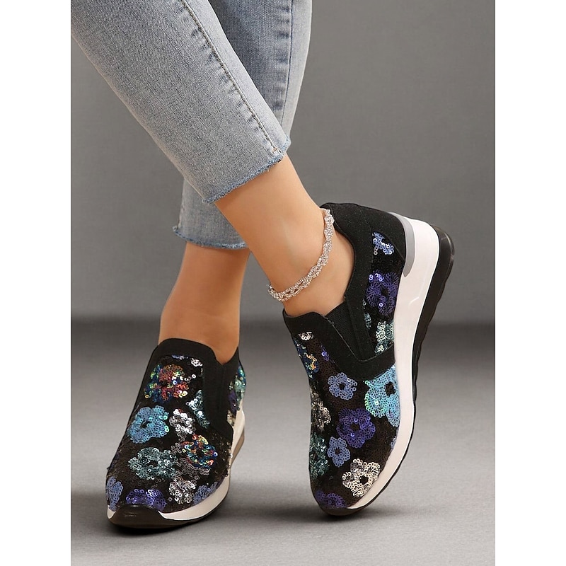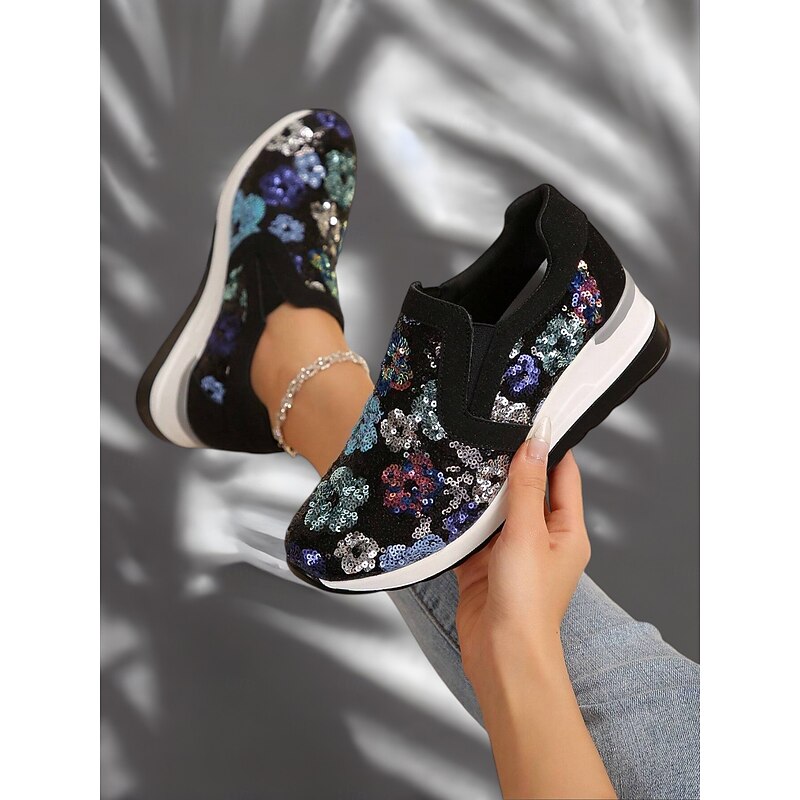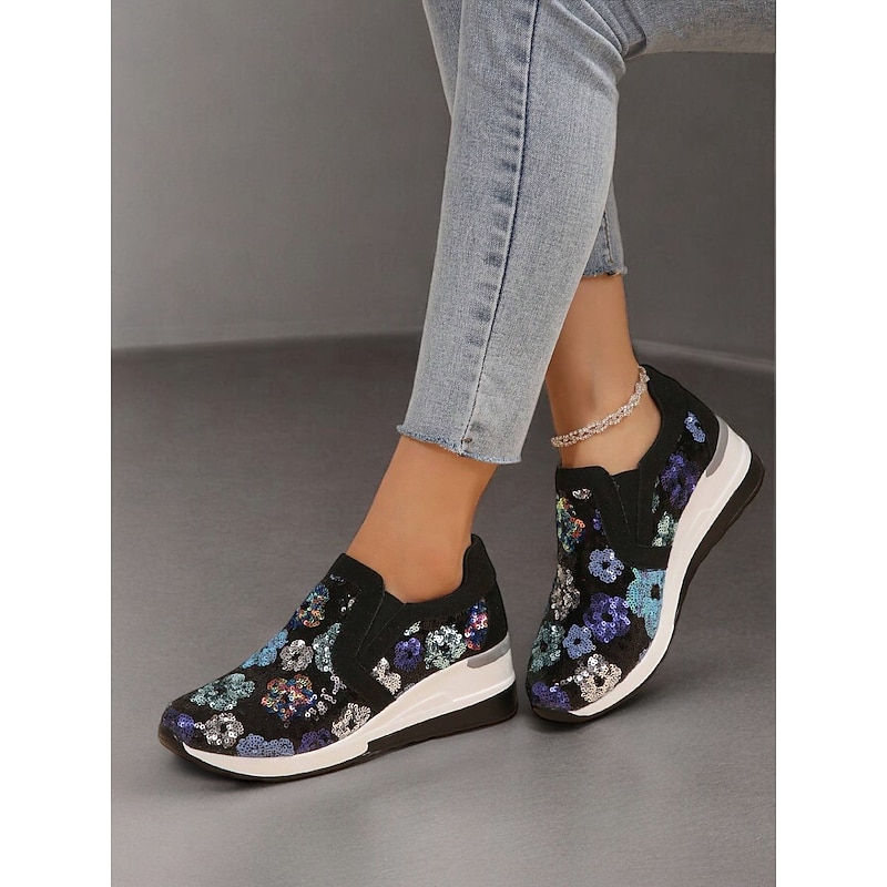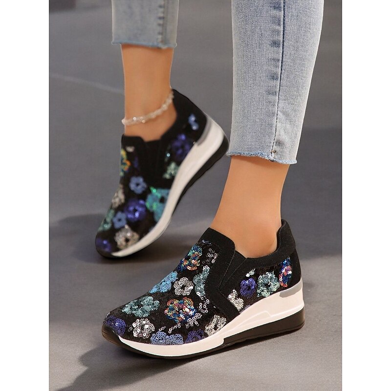 HOT ! Women's Floral Sequin Slip-On Sneakers - Comfortable Glitter Casual Shoes with Wedge Sole, Perfect for Walking or Party Wear