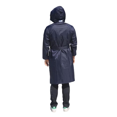 • · Waterproof Design: This raincoat features a stylish long design that extends below the knees. It’s made in a sleek navy color, with an integrated hood and coat for convenient storage. The coat is easily worn with buttons and a zipper, and the pocket is covered with a flap for excellent water resistance.