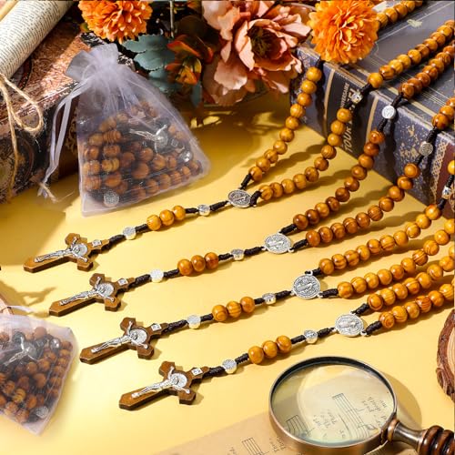 24 Set Wooden Bead Rosary Necklace Catholic Rosary Wood Carved Beads with Jesus Cross Our Father Solid with Organza Bag Pouch Baptism Favors Catholic Gift 4