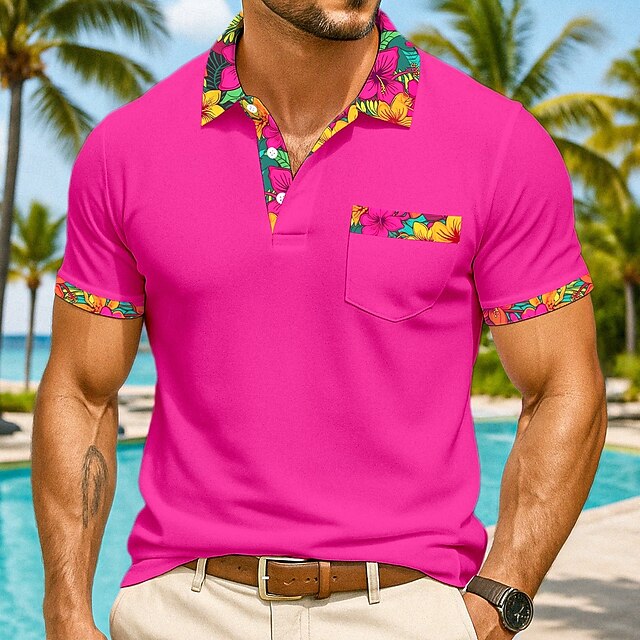 Men's Polo Golf Shirt Casual Holiday Lapel Short Sleeve Fashion Basic Floral Hawaii Patchwork Pocket Summer Spring Regular Fit Black White Fuchsia Turquoise Polo 7