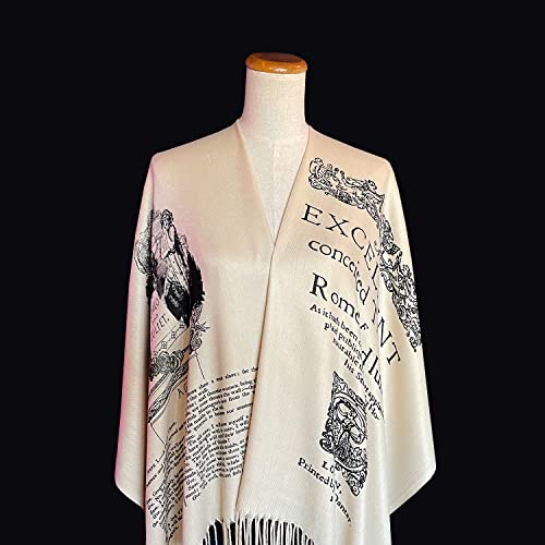 • A classic tragedy written by William Shakespeare - "An excellent conceited tragedy of Romeo and Juliet" book pages printed on a soft, beige colored acrylic shawl.