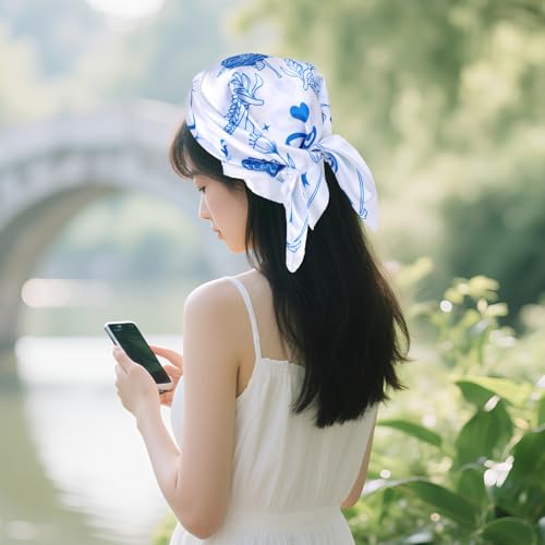 Bride Head Scarf, 23.62x23.62in Bachelorette Bandana White and Blue Silk Hat Scarf Elegant Bridal Hijab Wedding Handkerchief Bridesmaid Headwear for Bridal Shower Beach Party Accessory 7
