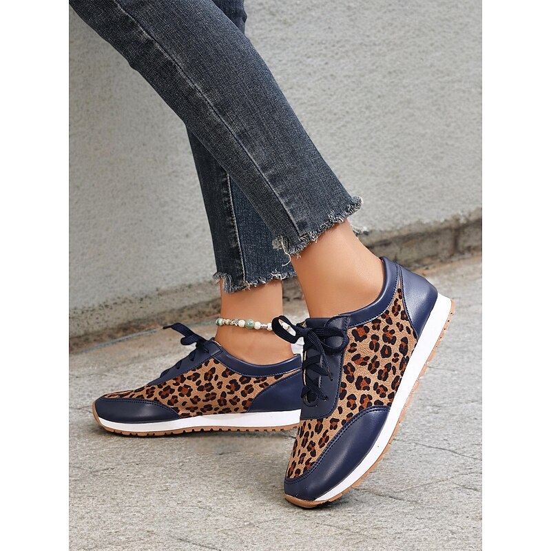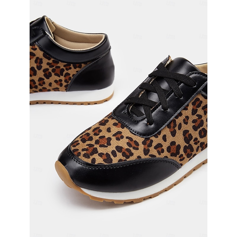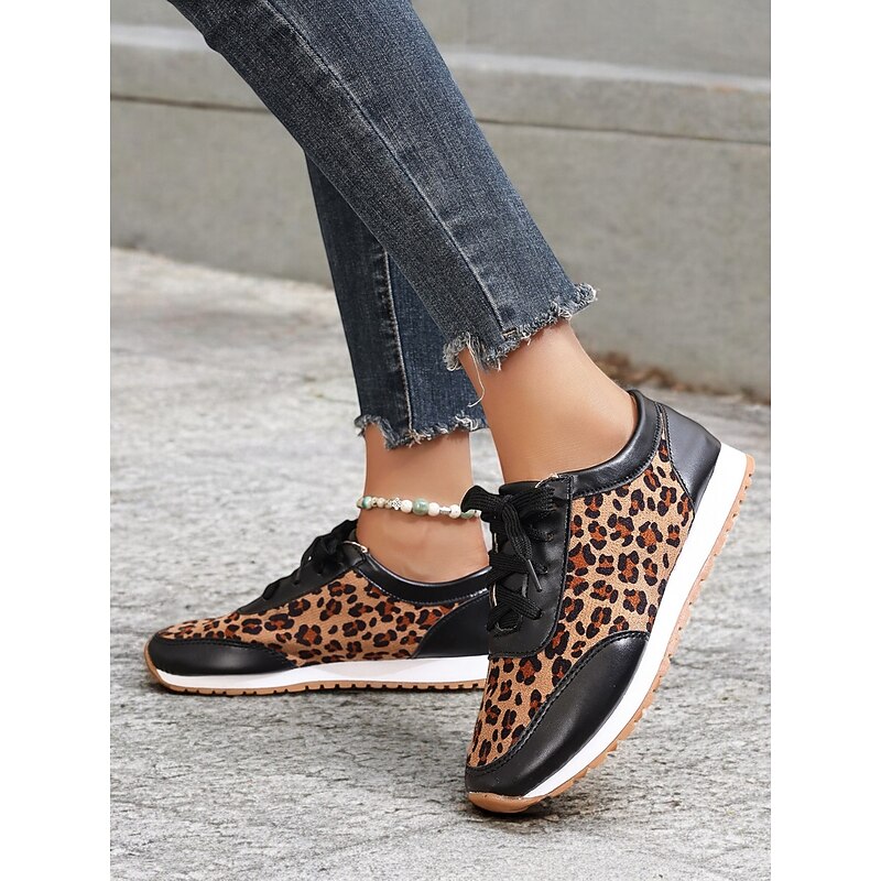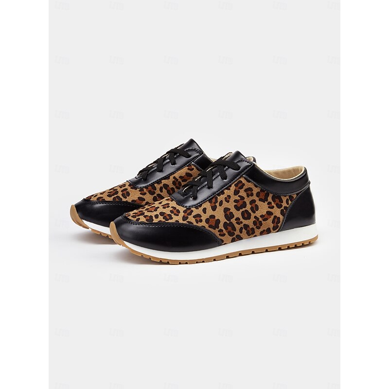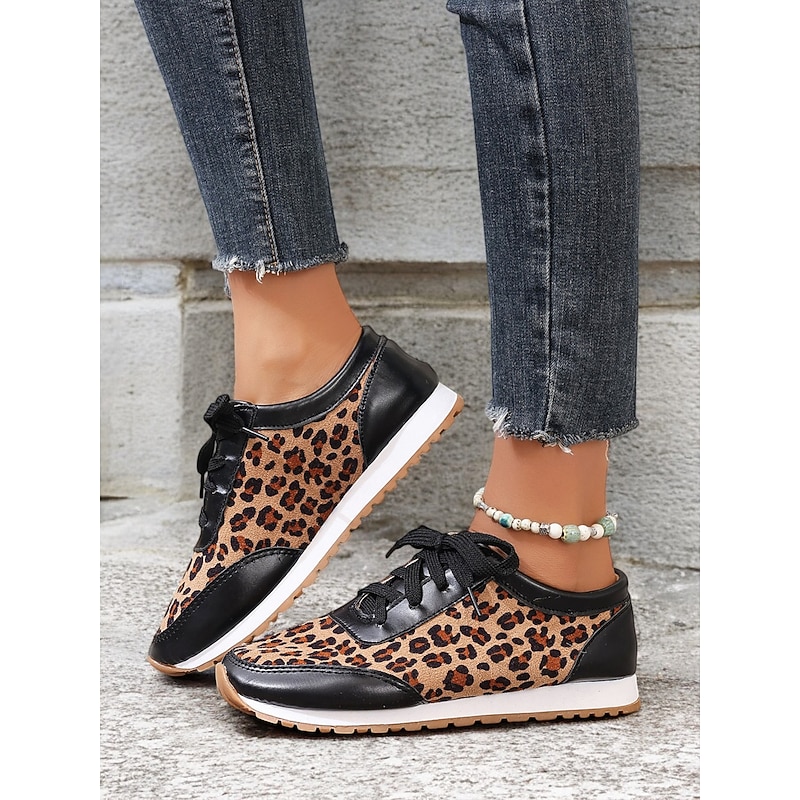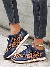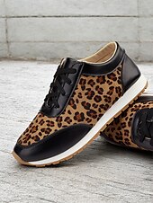 Highlights [Fabric and Material] : Crafted with a combination of faux leather and faux suede, these women's sneakers offer a stylish and durable design. The soft fabric upper ensures comfort throughout the day, while the black synthetic leather accents add a sleek, sophisticated contrast to the trendy leopard print pattern. [Style and Fit] : Featuring a flat heel and a round toe, these sneakers are tailored for a casual and comfortable fit. The lace-up closure allows for a customizable fit, ensuring they provide both style and practicality for everyday wear. [Design Highlights] : The standout leopard print design is complemented by black accents, creating an eye-catching and fashionable look. The cushioned interior enhances comfort, while the robust rubber outsole ensures excellent traction and grip. [Occasions] : Ideal for daily wear, these trendy sneakers add a bold statement to casual outfits. Perfect for everything from running errands to casual outings, they are designed to elevate any everyday ensemble with ease. [Size Range] : Available in a variety of sizes, these sneakers cater to a wide range of preferences. The sizes include US6 to US10.5, allowing you to find the perfect fit for a comfortable and stylish experience.